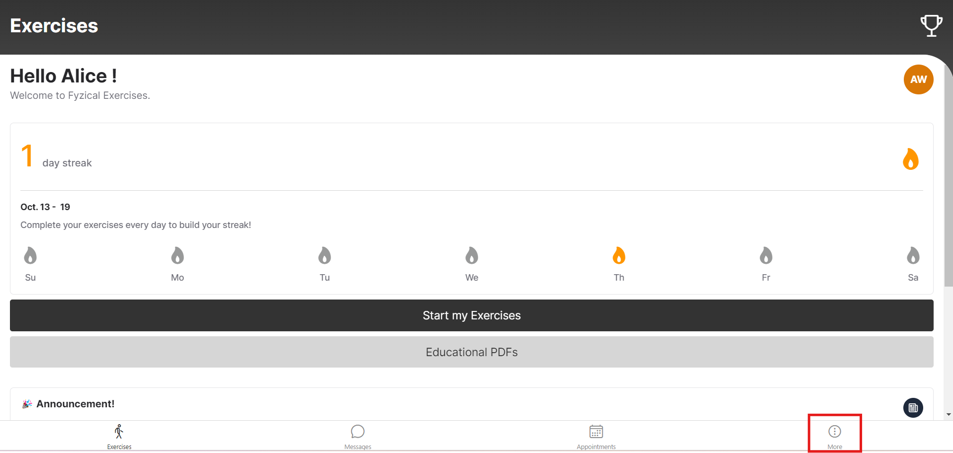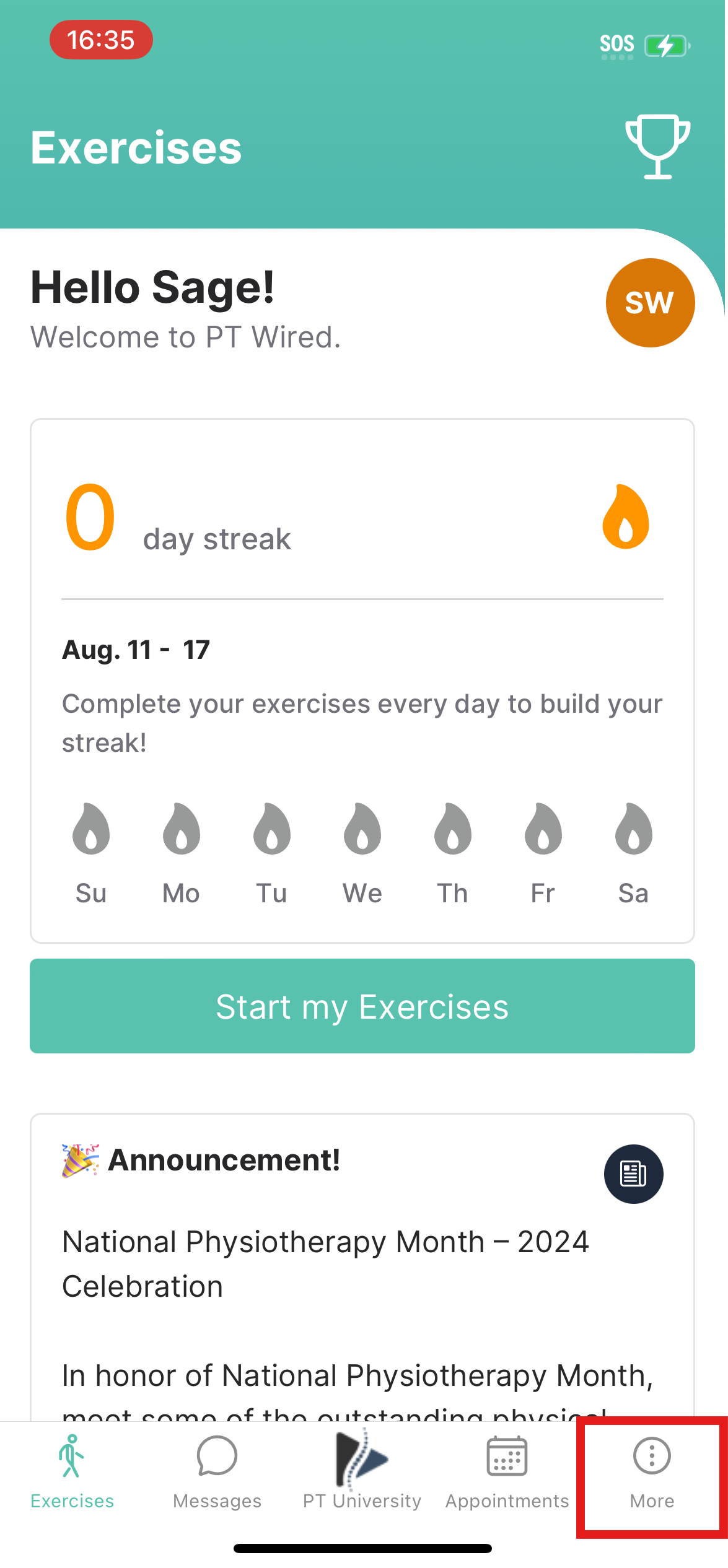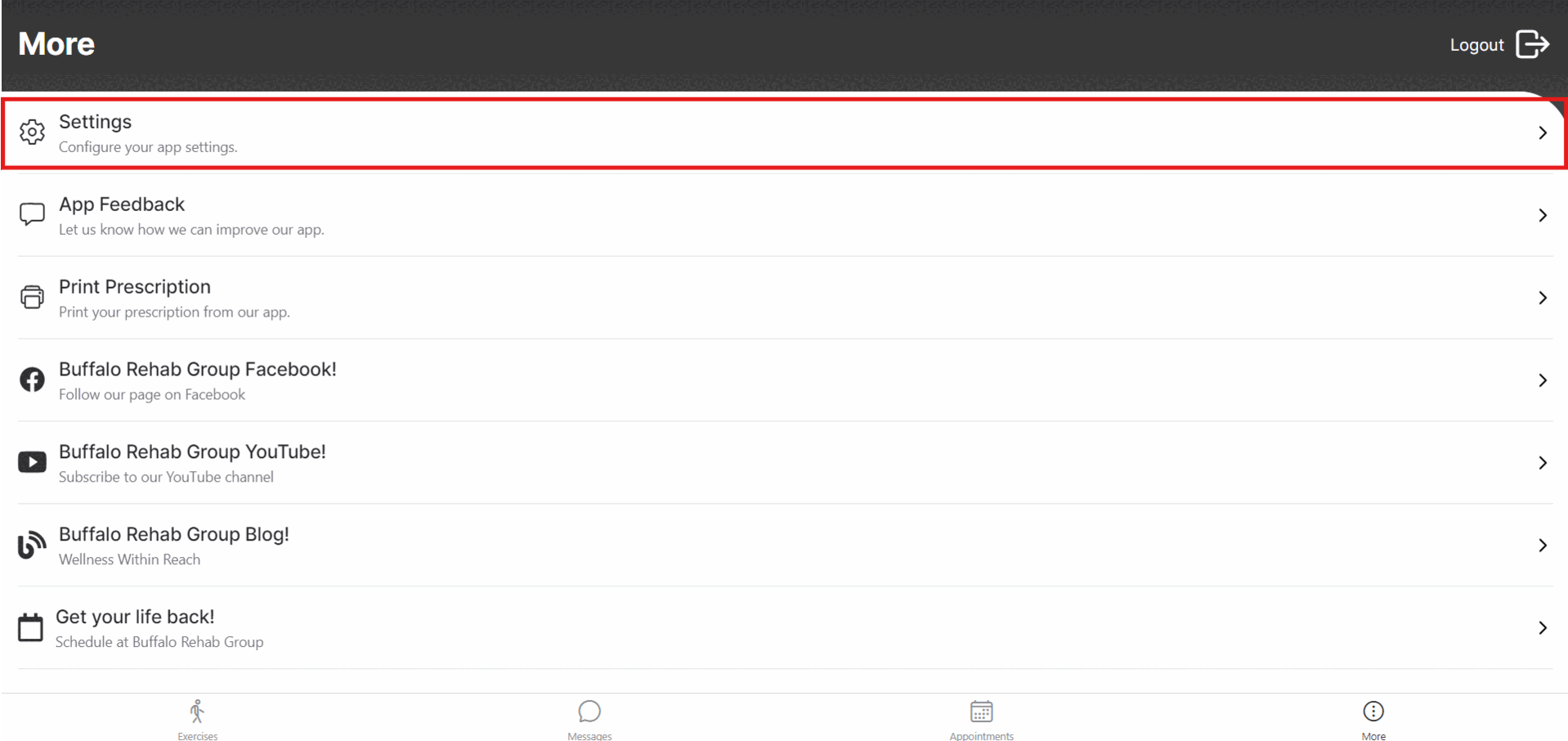 1.) Log in to the patient app and navigate to the 'More' tab on the lower right of the screen.