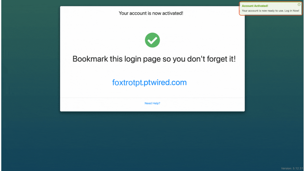 4.) A success prompt will be displayed at the top of the screen upon successful activation of your account.