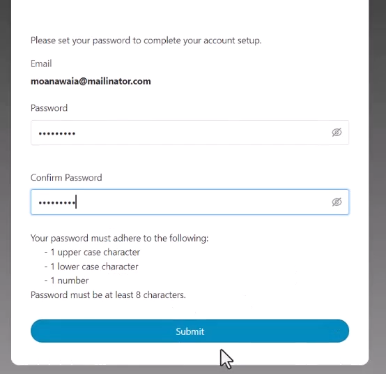 3.) You'll be redirected to a new page where you will be able to set up your password. Once set up, click the "Submit" button.