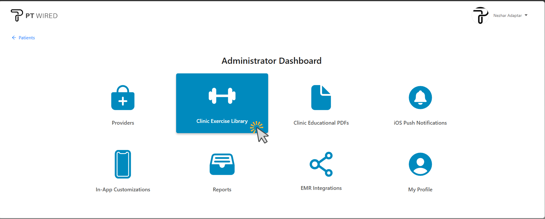 1. You'll need to be logged in as an Administrator to add a custom clinic exercise to the system. Navigate to the Administrator Dashboard and select the "Clinic Exercise Library" icon.