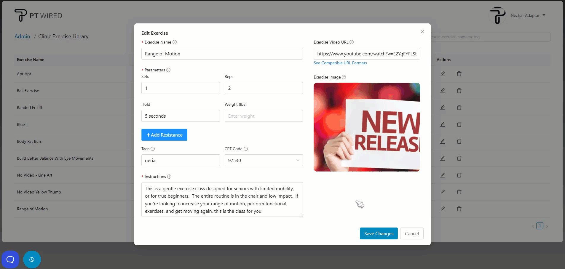 - Instructions - the exercise's default instructions. Although you can set a default parameters for your exercises, these can still be customized on a patient-to-patient basis. Maximum characters allowed is 1000