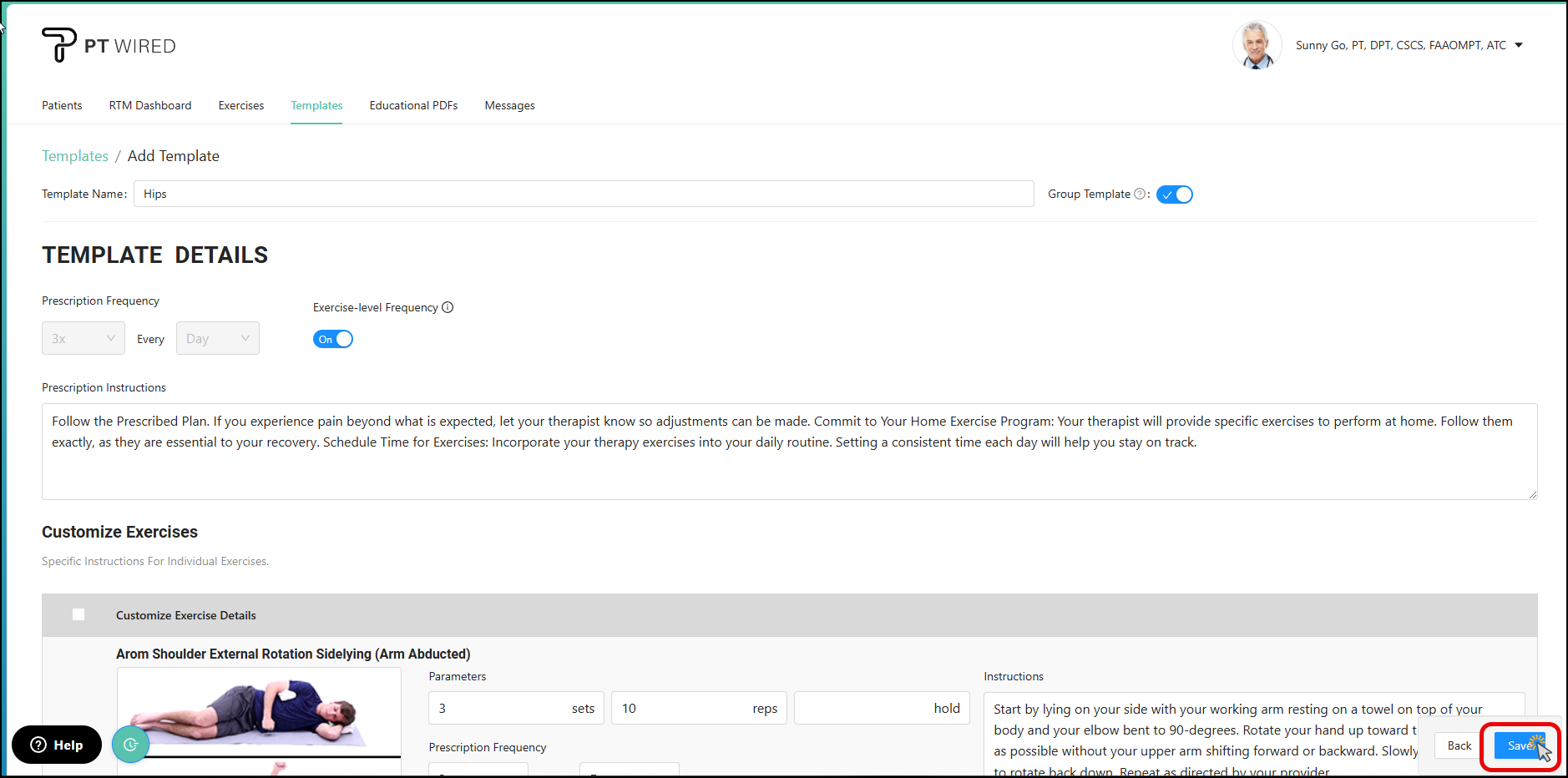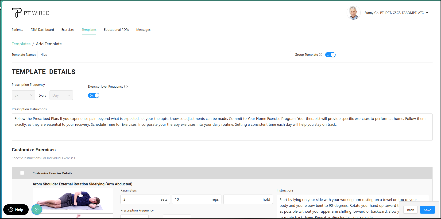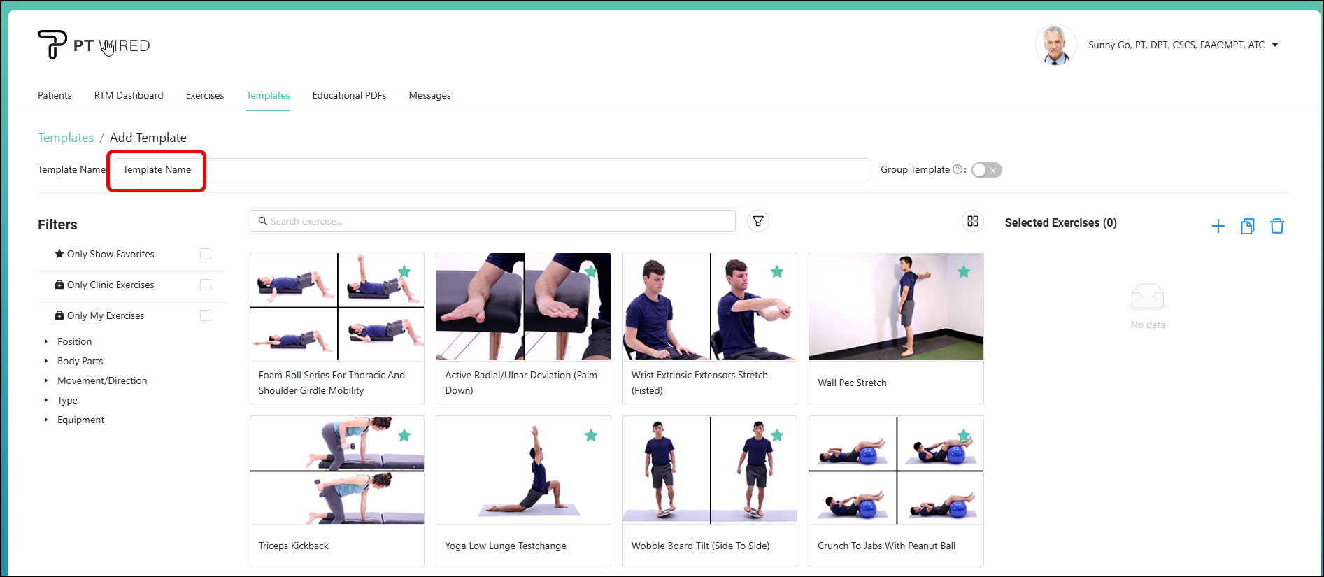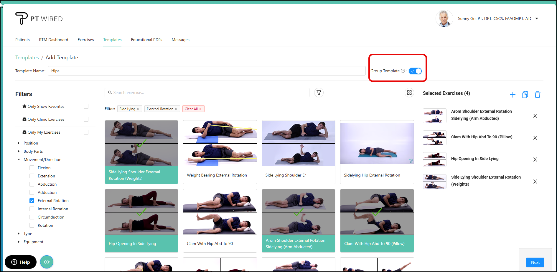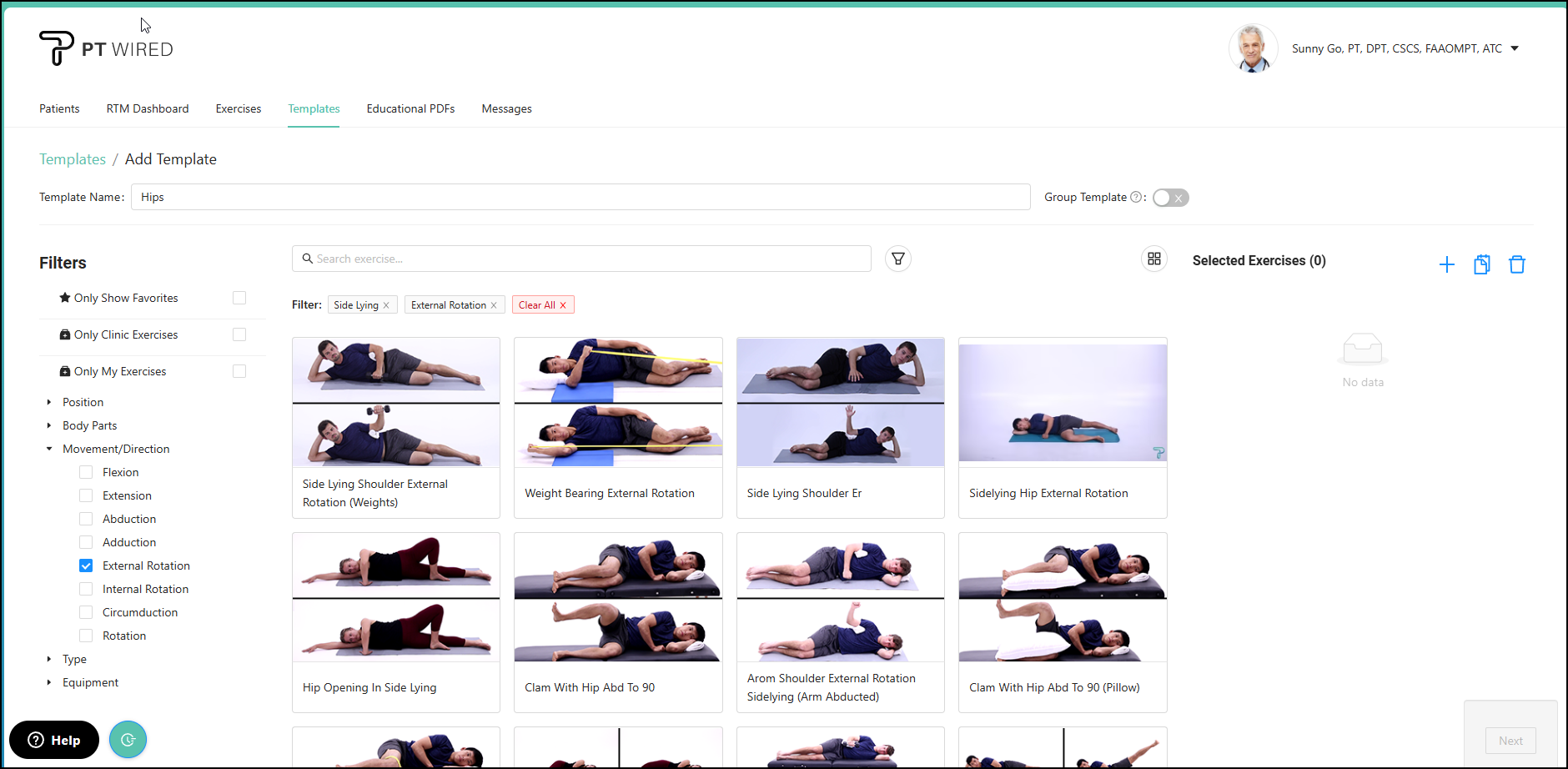 - For example, the below template name is "Hips." Followed by a search for "hip" exercises, as well as applying any filters (side-lying and exterior rotation) to narrow down the search.