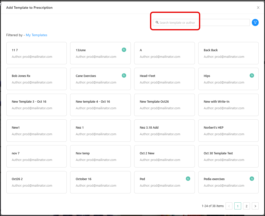 6.) From the 'Add Template to Prescription' pop-up, you'll be able to search for templates by template name, template author via the "Search" bar at the top right of the pop-up.