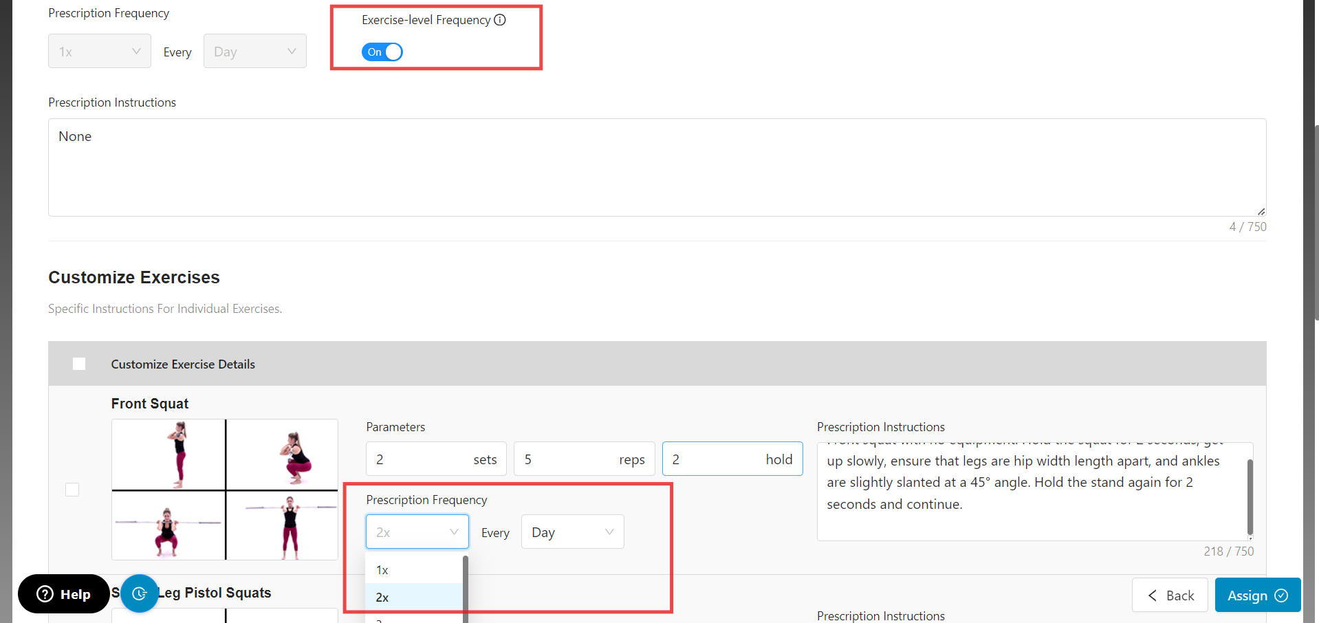 9.) After enabling the "Exercise Level Frequency", you can now customize the Prescription Frequency parameter for each of the individual exercises and set it to your desired frequency - for example, 3x per day, once a week.