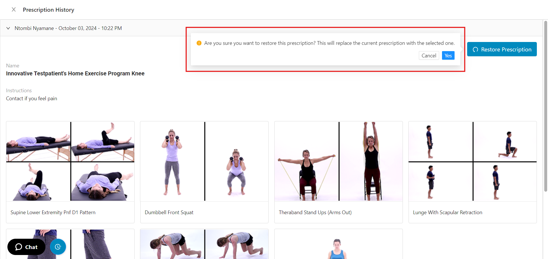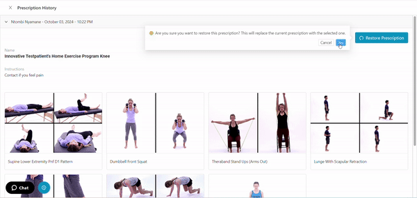 Providers can view the history of an exercise program, including creation and update dates, and who made the changes. Providers also have the option to restore previous versions.