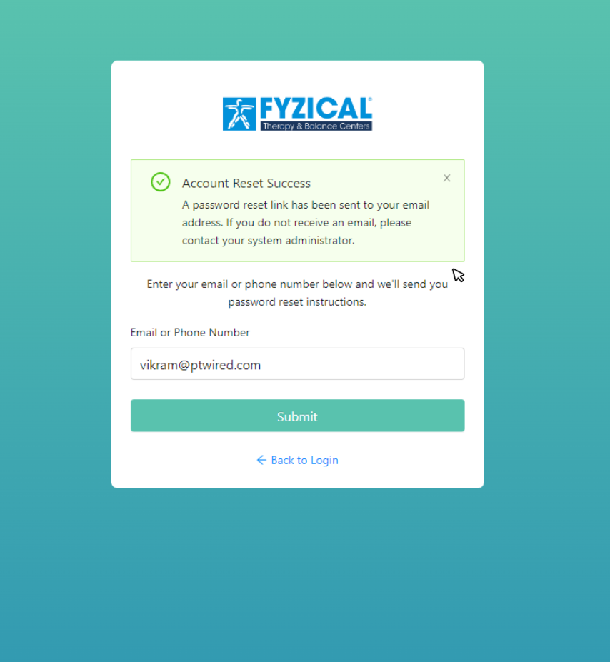 3.) You'll receive a success prompt informing you that an email with a link to reset your password has been sent to your email address provided.