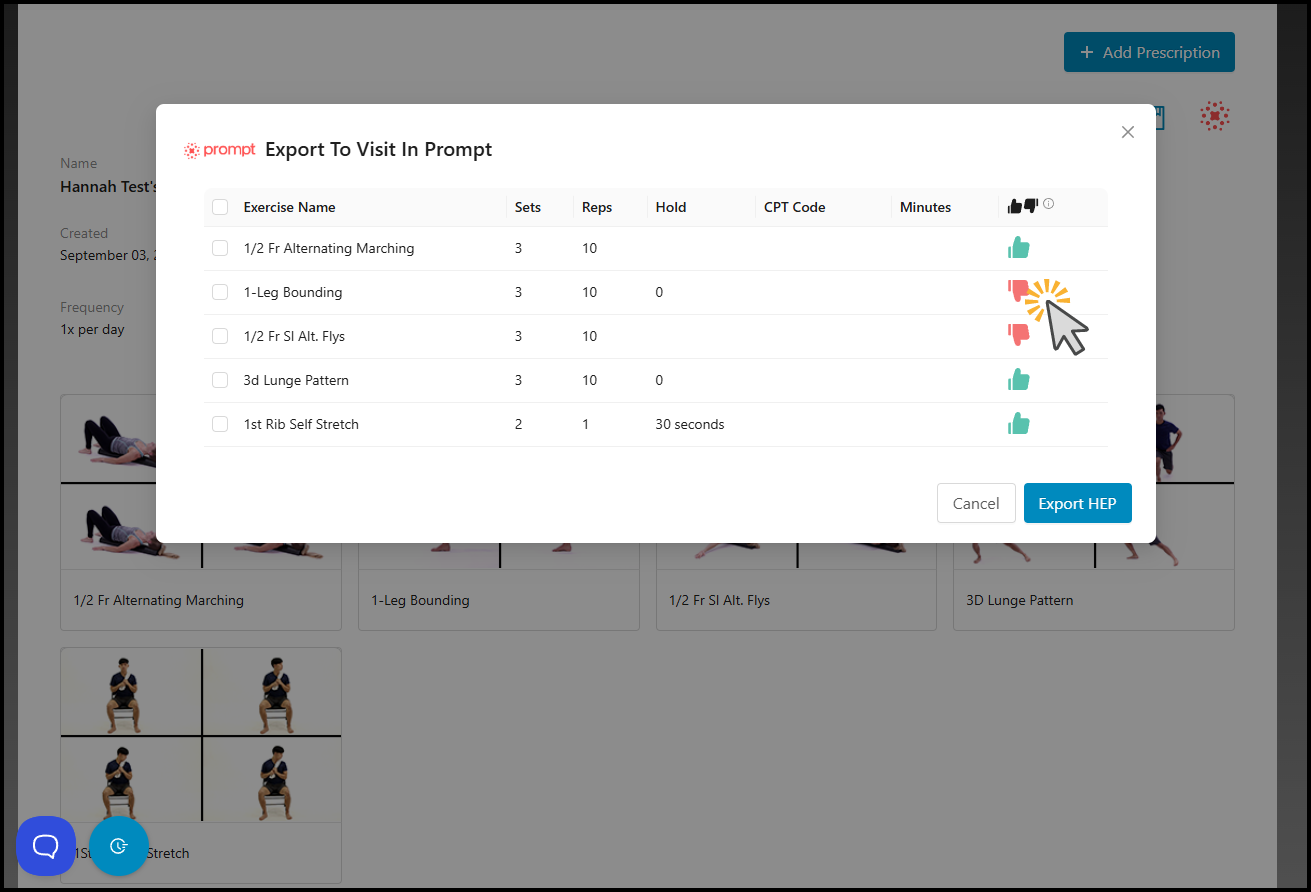 If you'd like to export all of the exercises in the patient's current prescription, leave the thumb marks green.