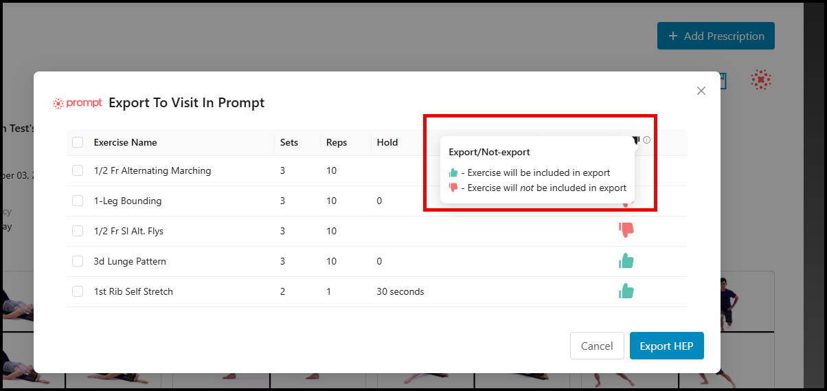 4.) Once the button has been clicked, the "Export To Visit in Prompt" pop-up will be displayed, allowing the provider to export all the exercises, or only specific exercises from the prescription.