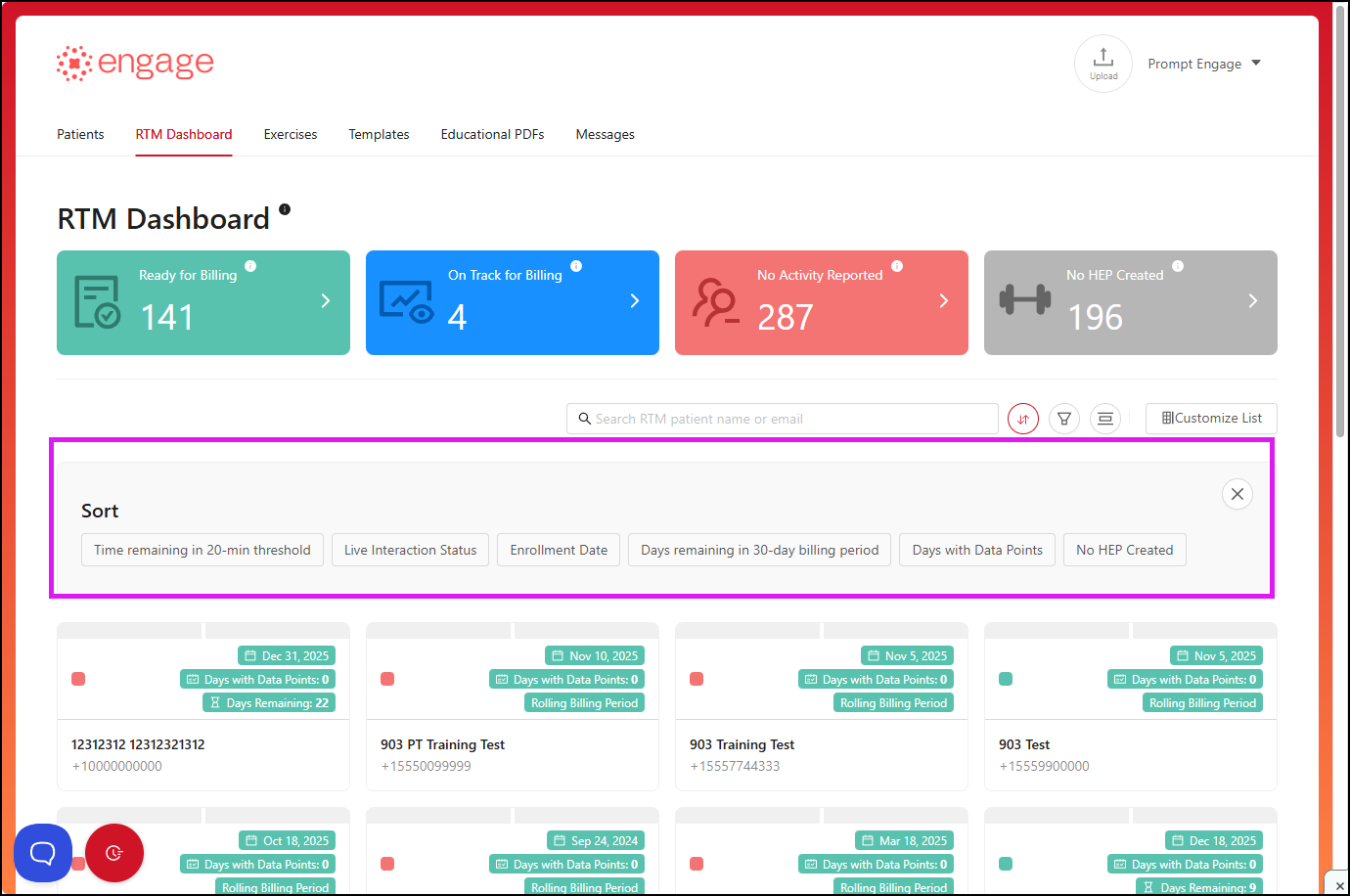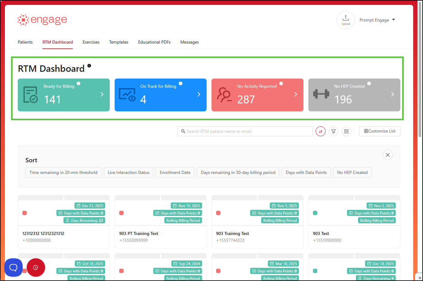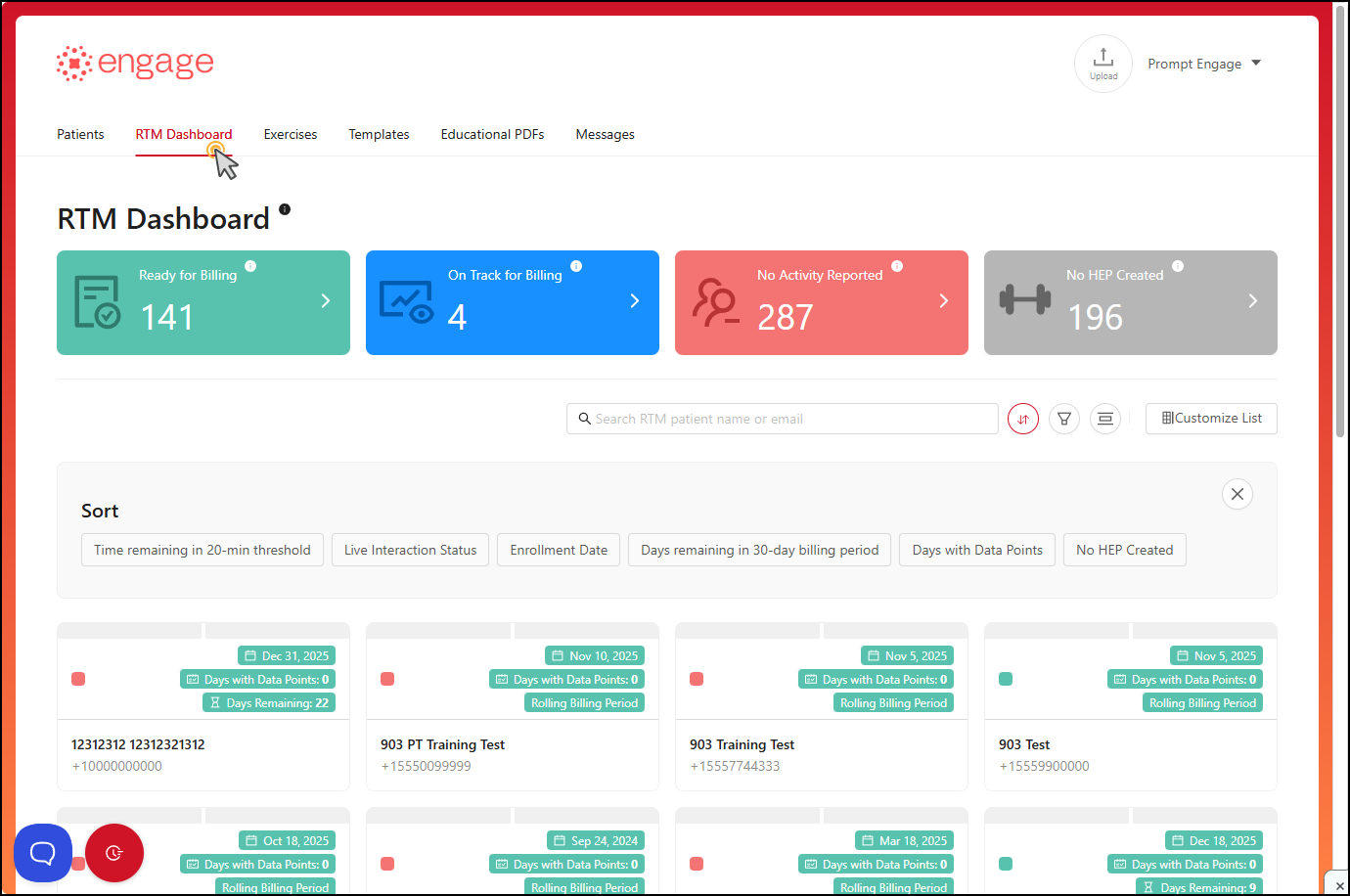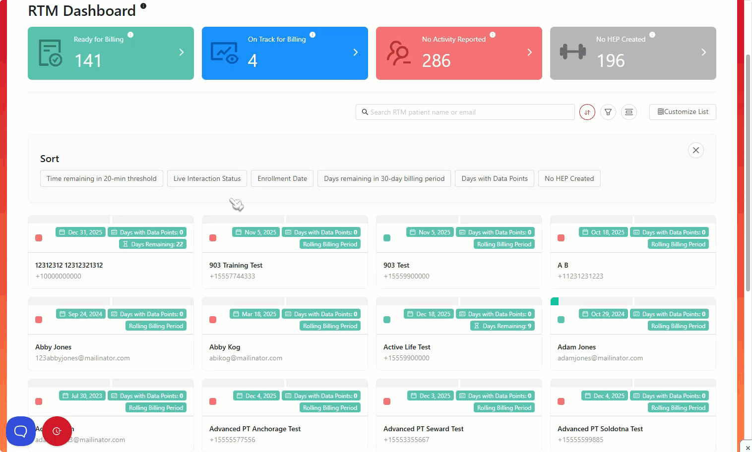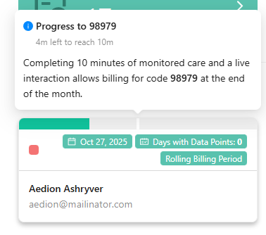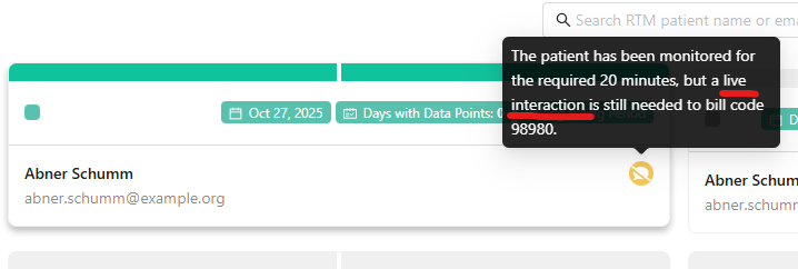 Ready for Billing — These patients have satisfied one or more RTM billing code requirements. For more details on the bill dates, codes and supporting documentation, click on the patient's card and choose the "Billing" option.