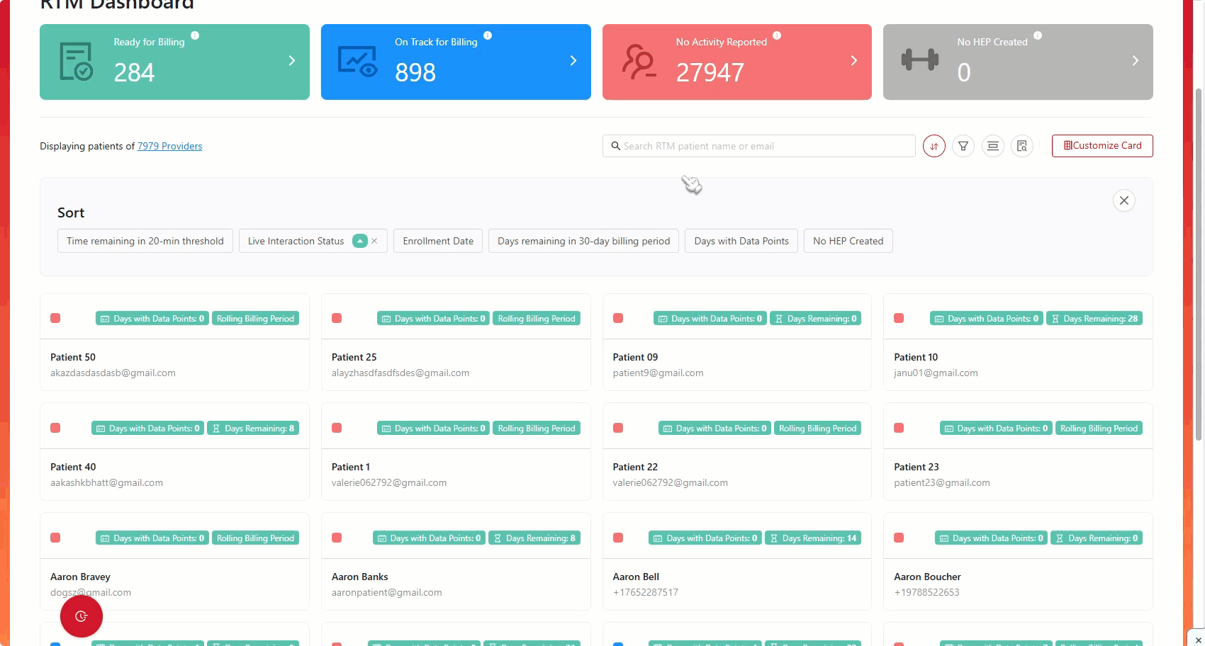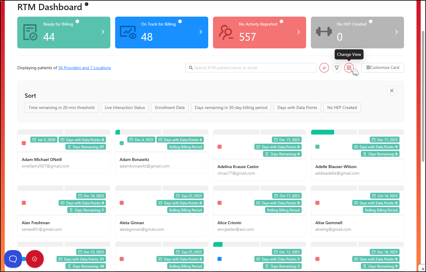 The filter buttons enable providers to refine their patient list by identifying those who are approaching billing requirements and those who need increased engagement with the app. Additionally, they allow providers to toggle between viewing their own RTM patients or those of selected colleagues — up to 50 at a time — and customize the layout of the RTM patient card view.
