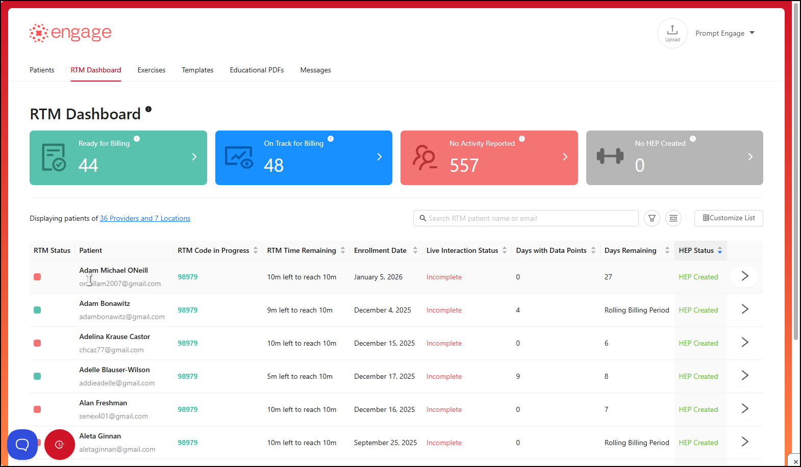 - No HEP Created — These patients have had at least one completed visit but do not yet have an assigned Home Exercise Program (HEP).