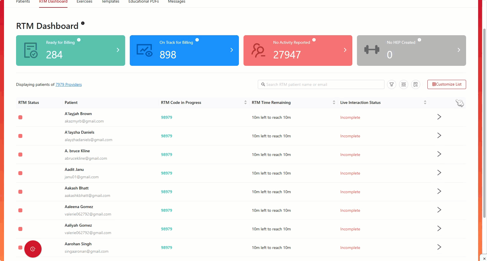 Providers can easily locate patients in the system by making use of the search bar to search for RTM patients by name, or by email address.