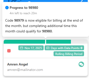 On Track for Billing — Based on their current activity levels thus far in the billing period, these patients will qualify for billing codes 98975 and/or 98977 at the end of the billing period.