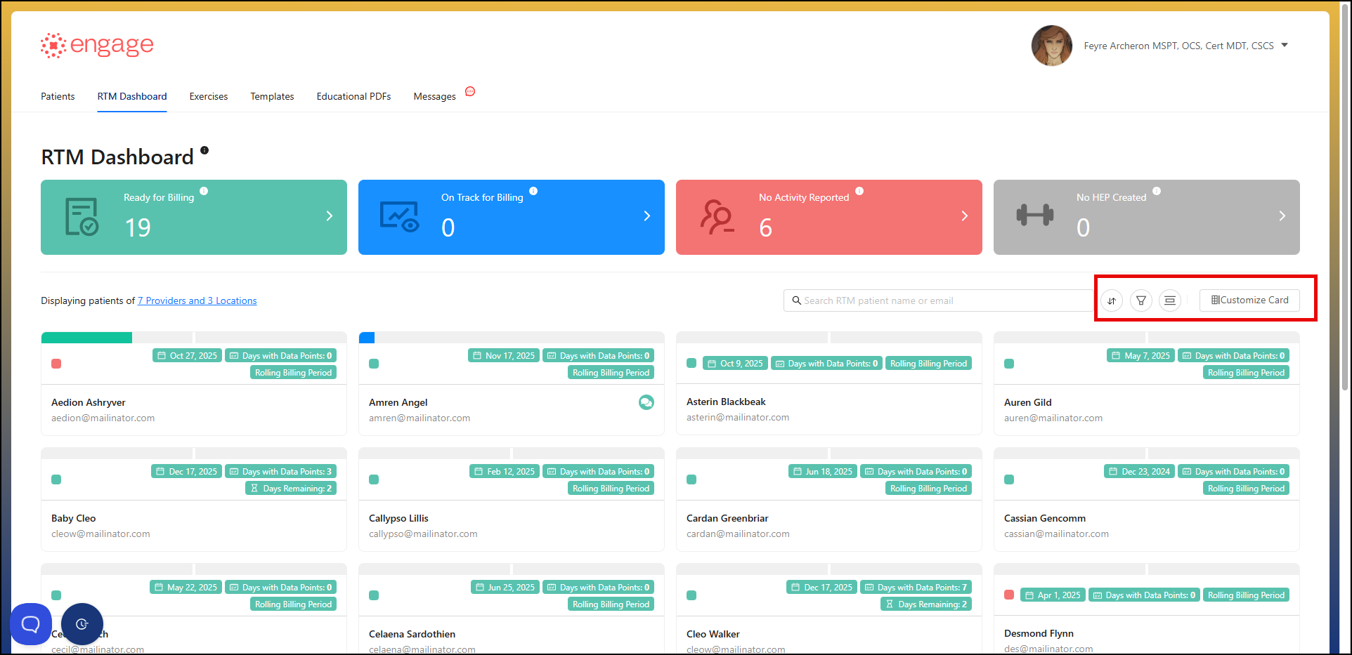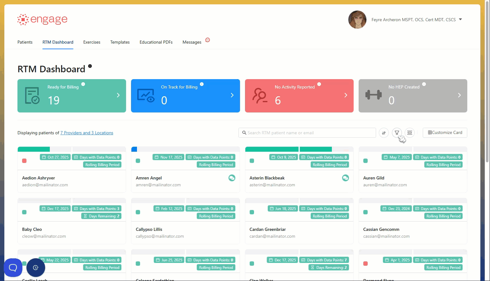 The filter buttons enable providers to refine their patient list by identifying those who are approaching billing requirements and those who need increased engagement with the app. Additionally, they allow providers to toggle between viewing their own RTM patients or those of selected colleagues — up to 50 at a time — and customize the layout of the RTM patient card view.