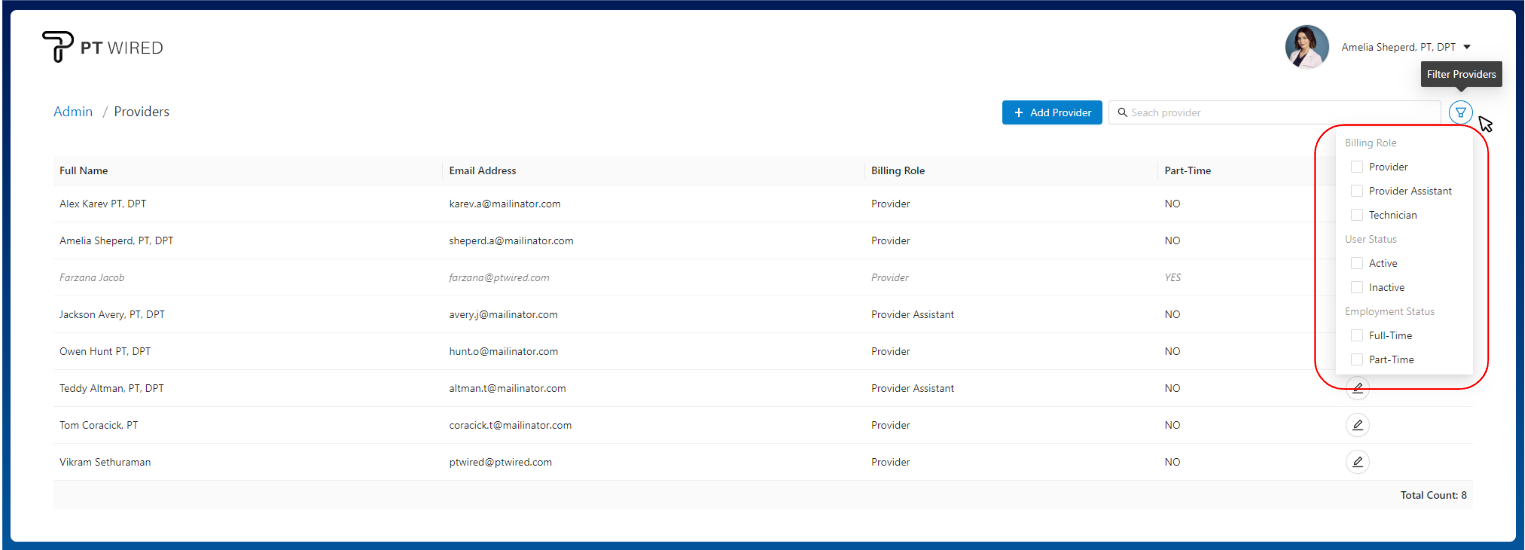 4.) On the "Providers" page, you'll be able to use the "Filter by" button next to the search bar to filter providers according to their: