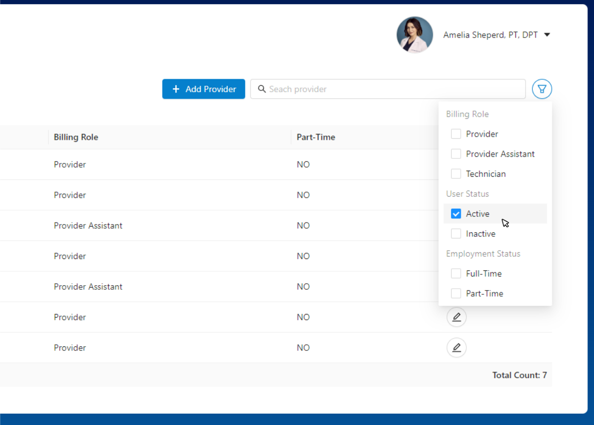 5.) If we check the box for "Active," the initial list of therapists is reduced from a total of 5 to 4. Meaning there is 1 "Inactive" user.