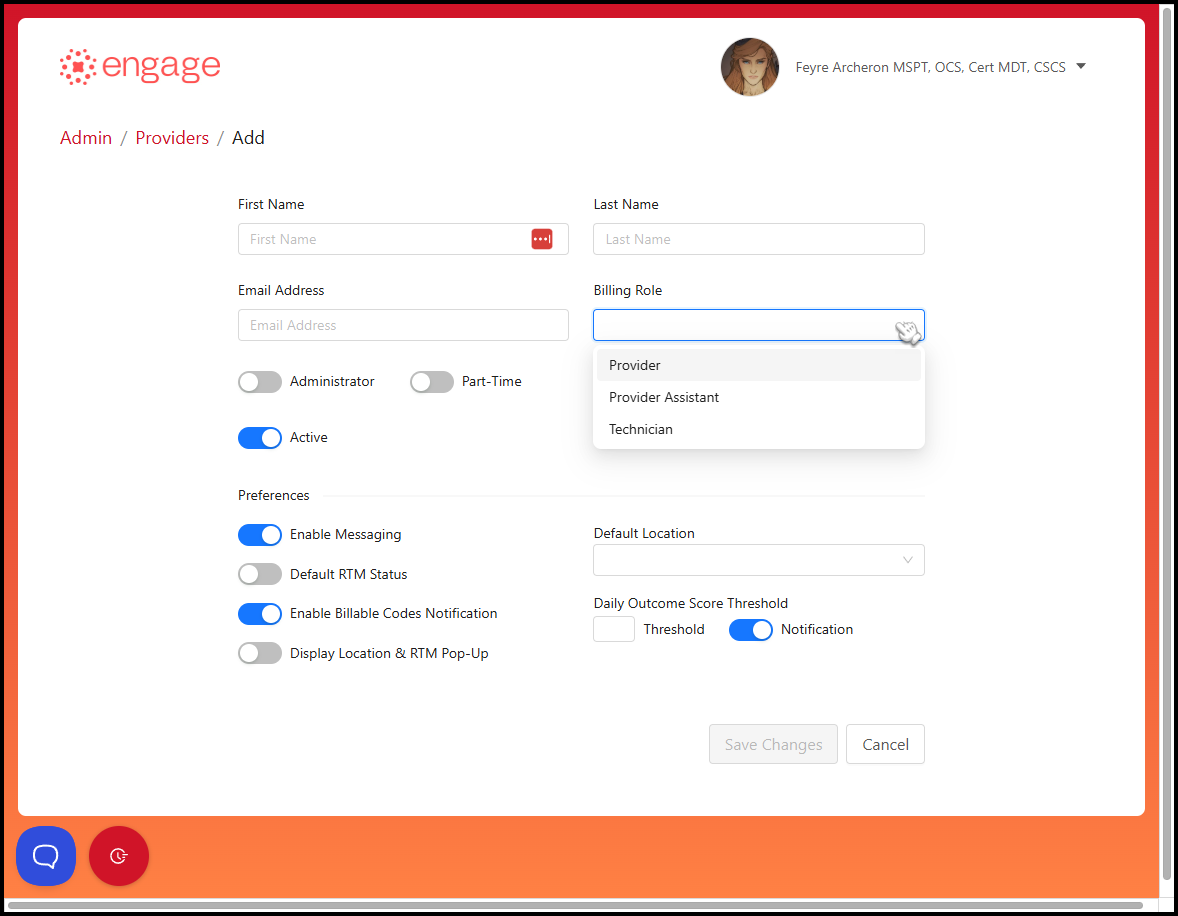 - Billing role - the billing can either be a Provider, Provider Assistant or a Technician
