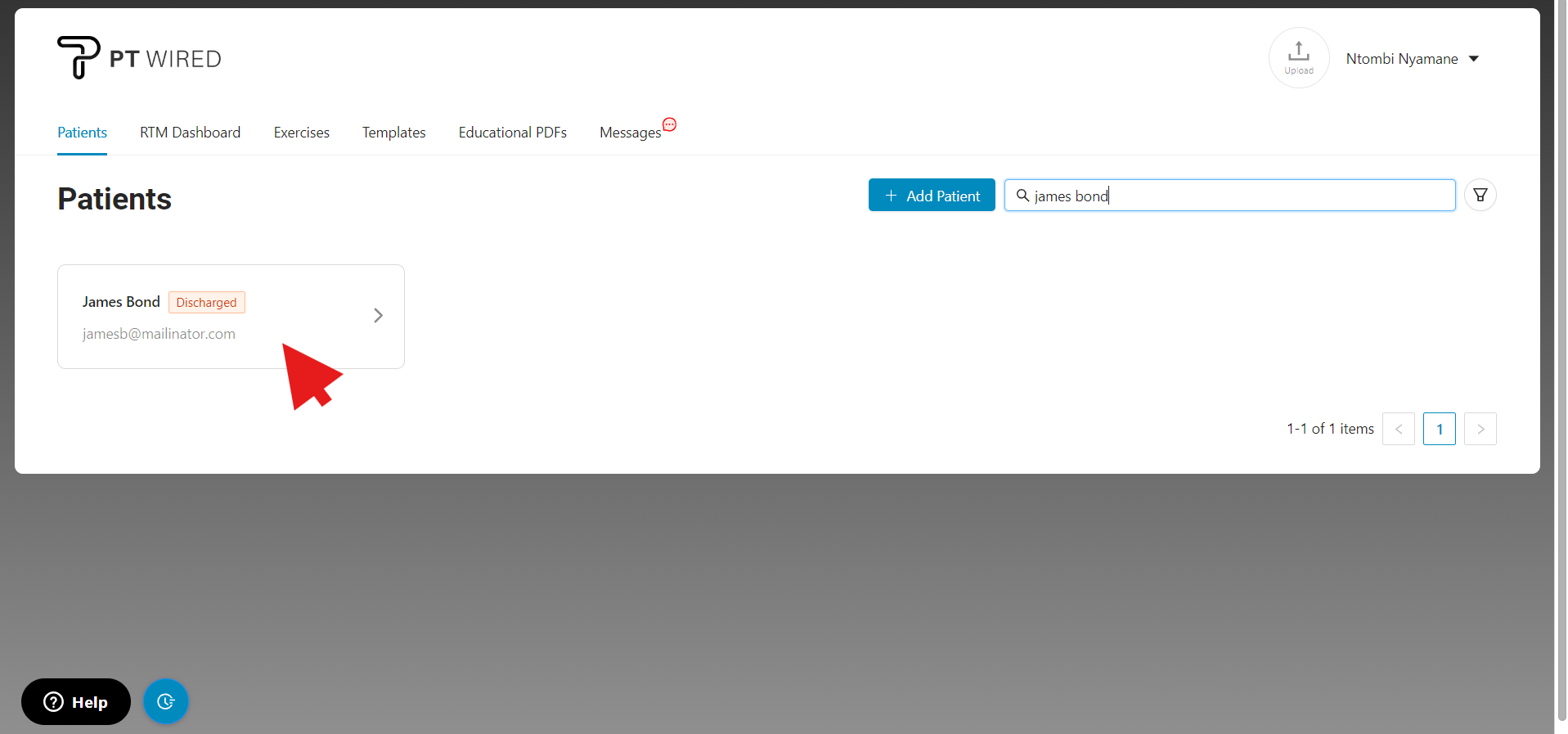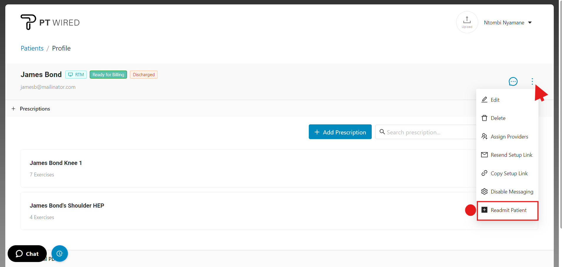 2. Once in the patient's profile, click on the 3 vertical dots next to the message icon to open the details menu, then click on 'Readmit Patient'