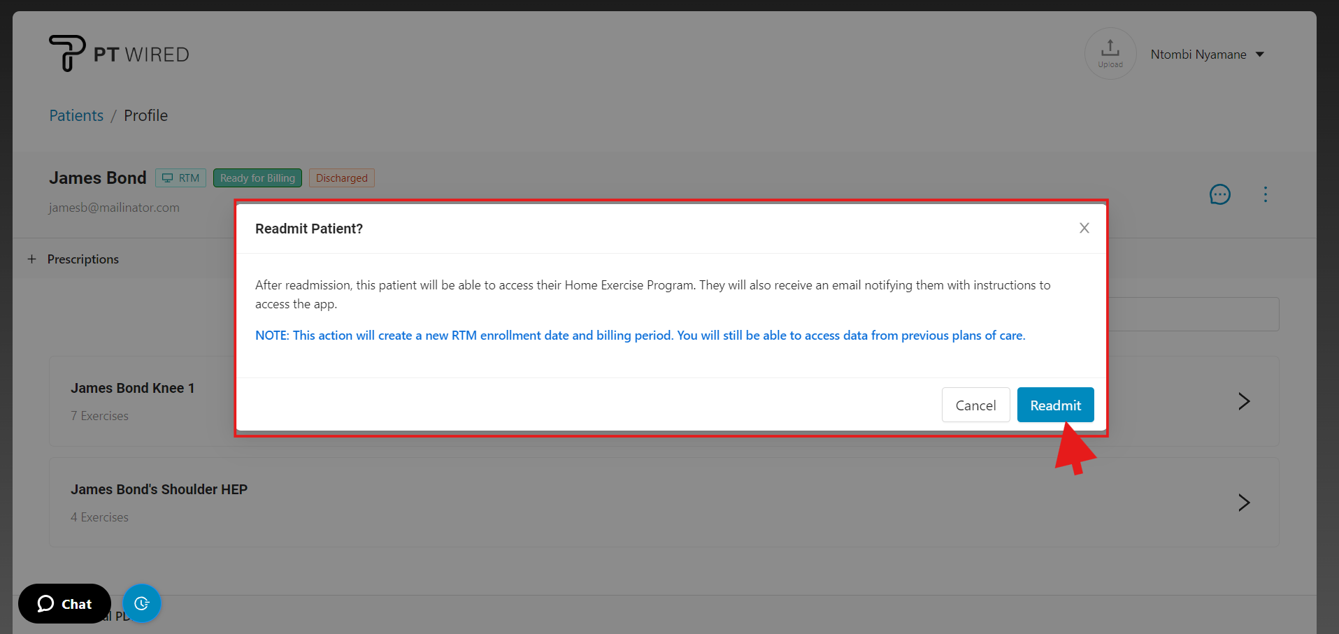 3. A notification pop-up will appear, alerting you that the patient will now have access to their Home Exercise Program and that you will be able to view previous plans of care. Click the 'Readmit' button.