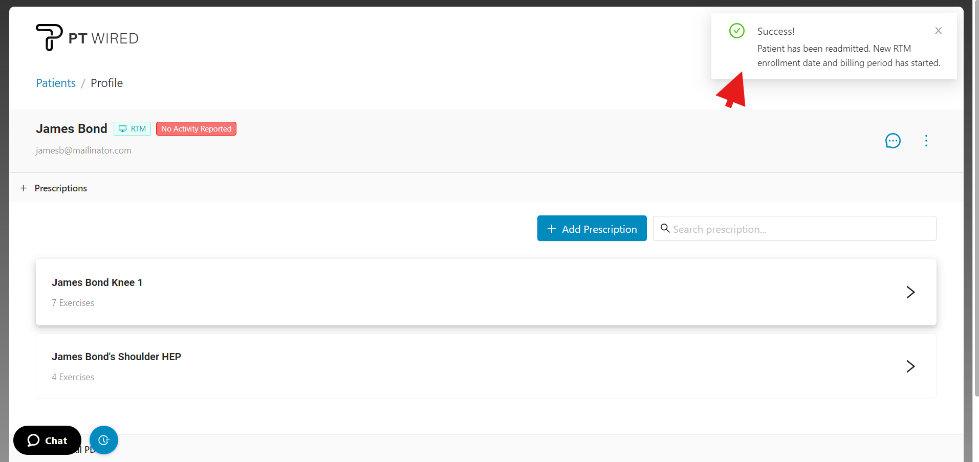4. A notification message "Success! Patient has been readmitted. New RTM enrollment date and billing period has started." letting the provider know that the patient has been successfully readmitted.
