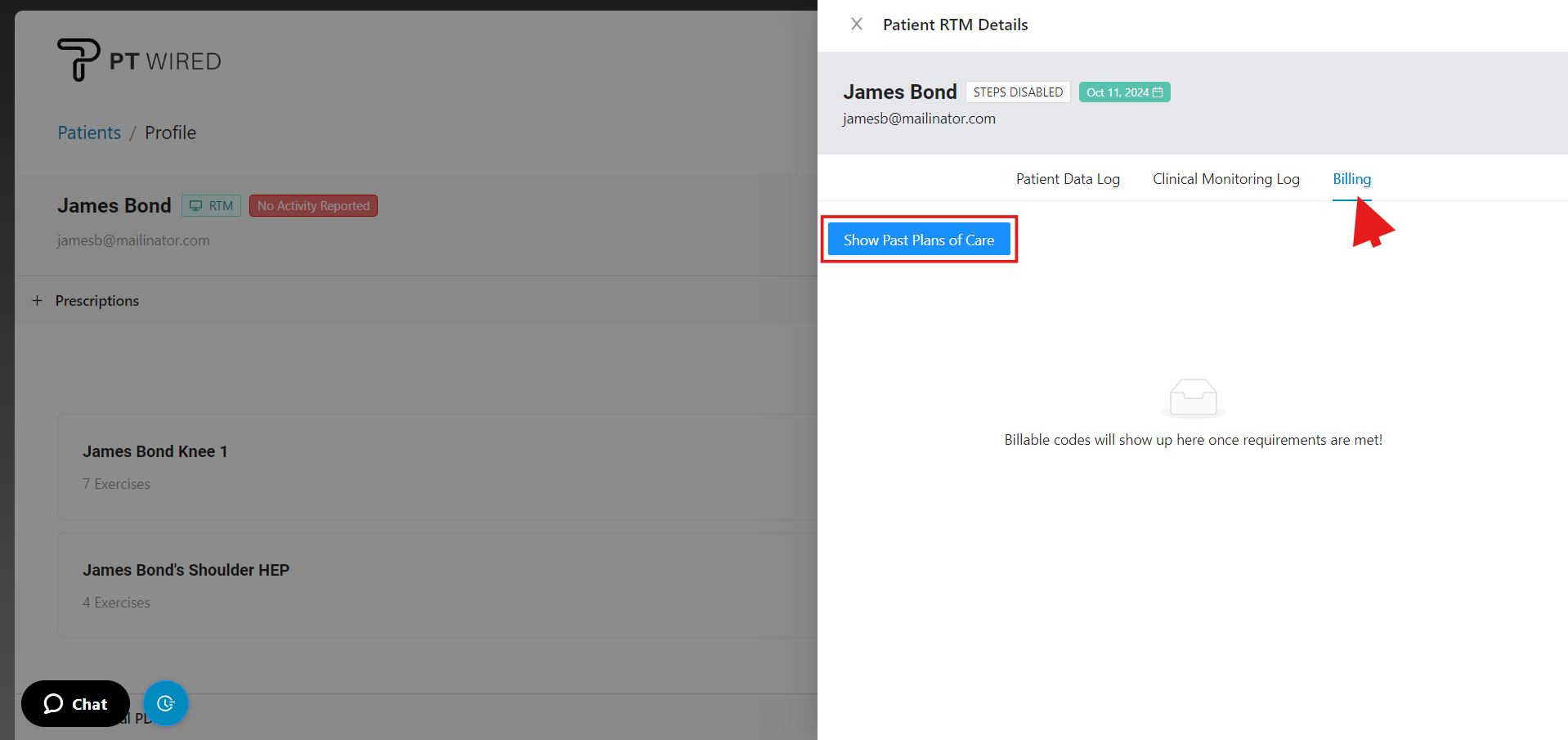 When an RTM patient with both unbilled and billed codes is discharged and later re-admitted, a 'Show Past Plans of Care' button will appear under the 'Billing' tab in the RTM Details Tray.