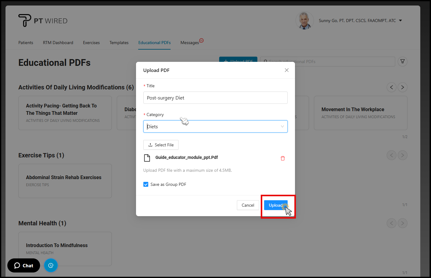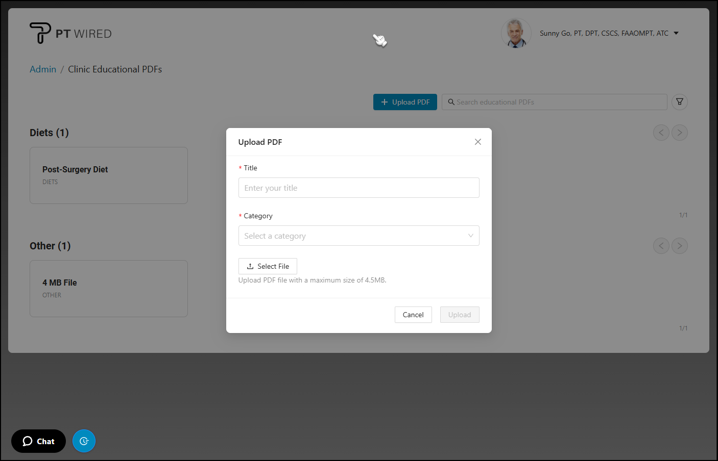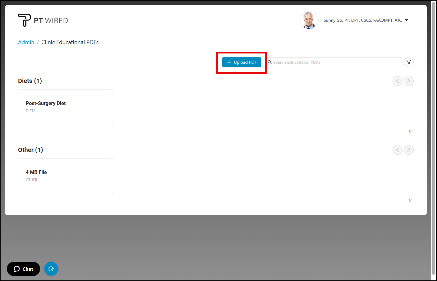 Uploading a Clinic Educational PDF via the main 'Educational PDFs' Tab