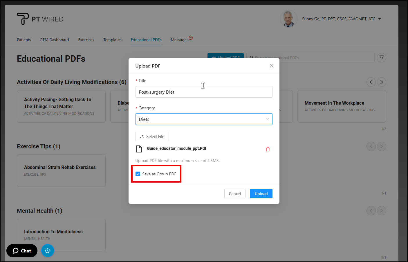 - On the pop-up, enter a title & select a category for your PDF. Select a file from your computer that you want to upload - this file should be less than 4.5 MB. Click the radio button for 'Save as Group PDF' to share the PDF to all providers in your group.
