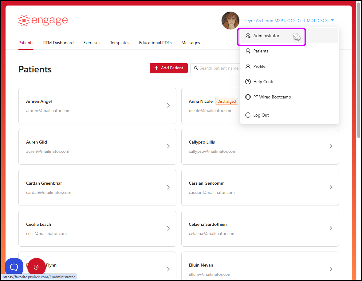 1.) Log in to the Prompt Engage platform as an Admin. Navigate to top right corner of the screen; hover over your name and click it. From the dropdown menu, click the 'Administrator' button.
