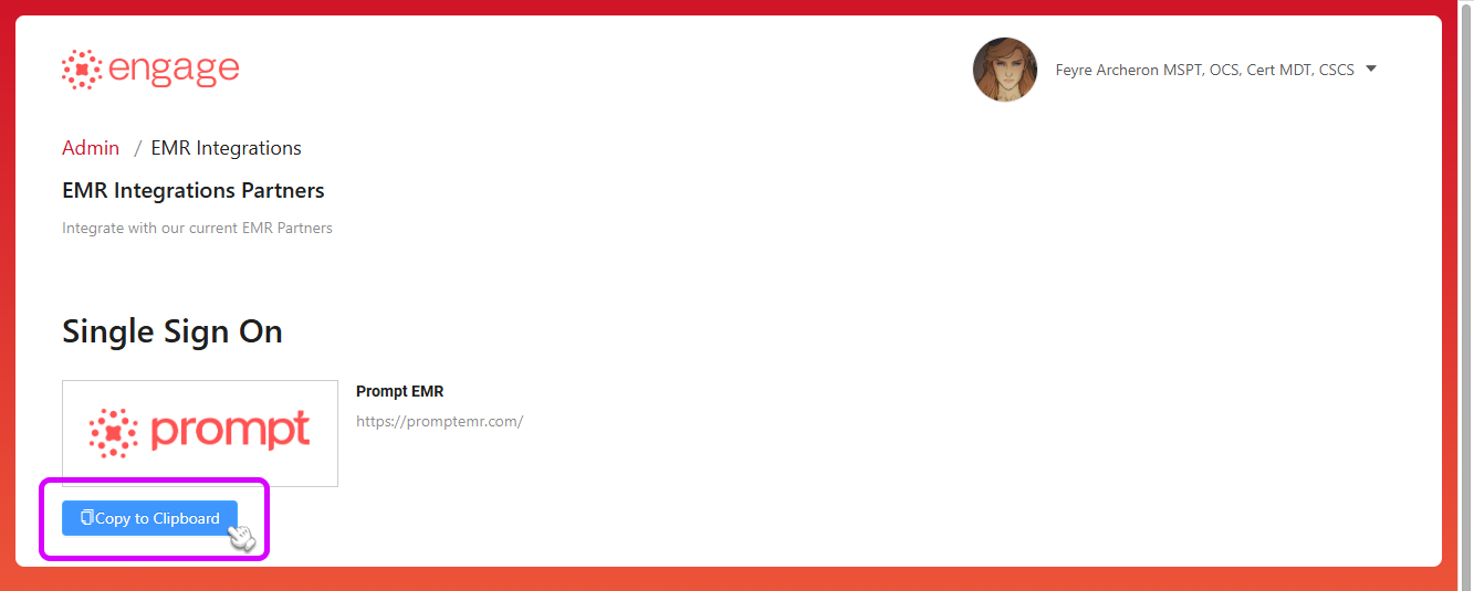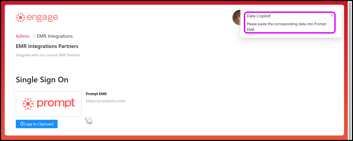 5.) A Data Copied! Please paste the corresponding data into Prompt EMR notification will appear in the top right corner once the Prompt Integration code has been successfully copied.