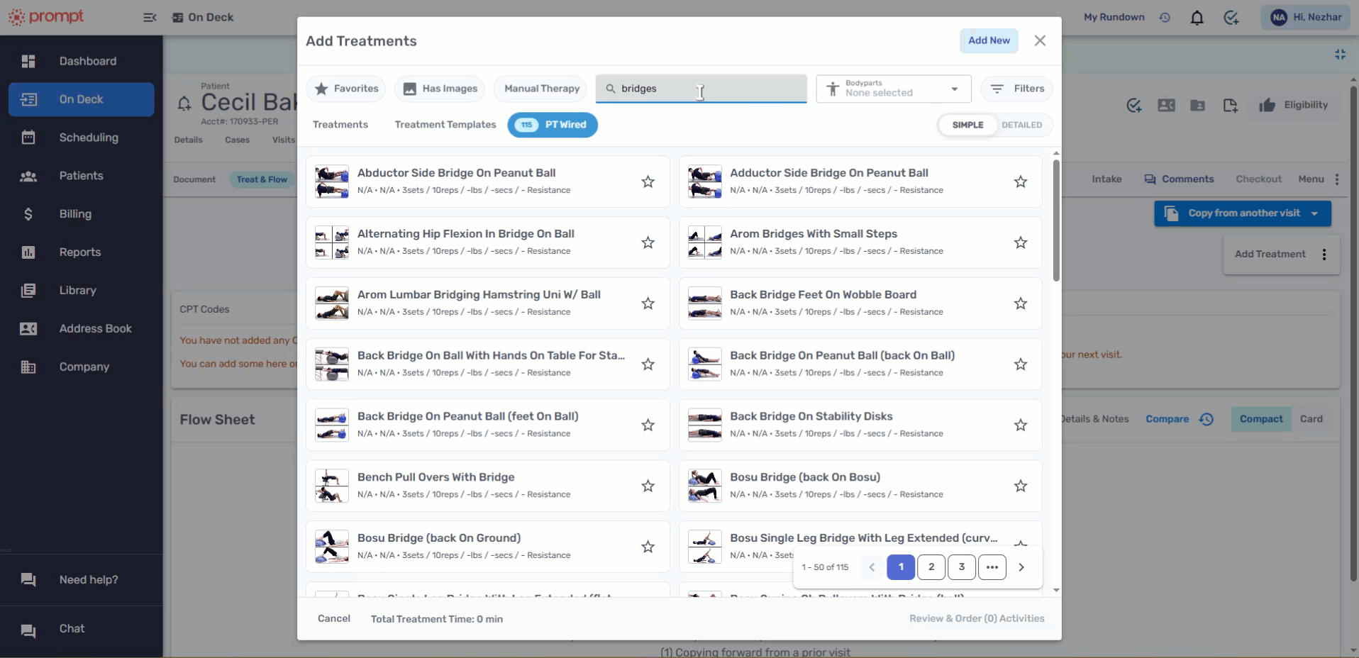 14.) From the Flow Sheet, click the 'Add Treatment' button and then select the 'PT Wired' tab to start searching for exercises in the PT Wired Exercise Library.