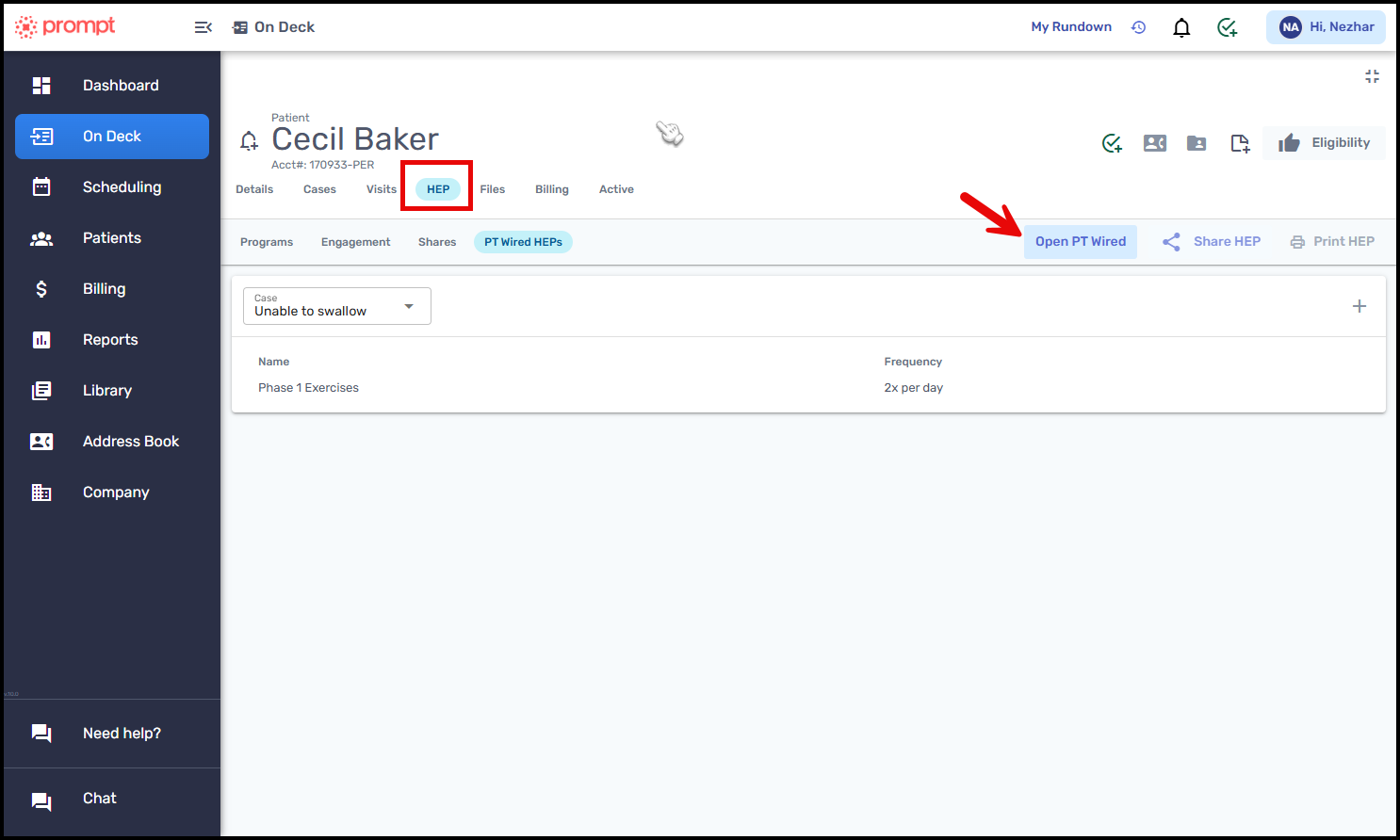 Providers still have the option of importing patients from Prompt to PT Wired by using the 'Open PT Wired' button and then building the home exercise program from the PT Wired HEP builder.