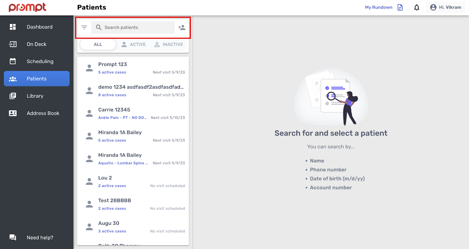 3.) You can either search for an existing patient using the search bar at the top of the page, or create a new patient by clicking the 'Add New Patient' button to the right of the search bar. Select the patient whose profile you’d like to open in PT Wired.