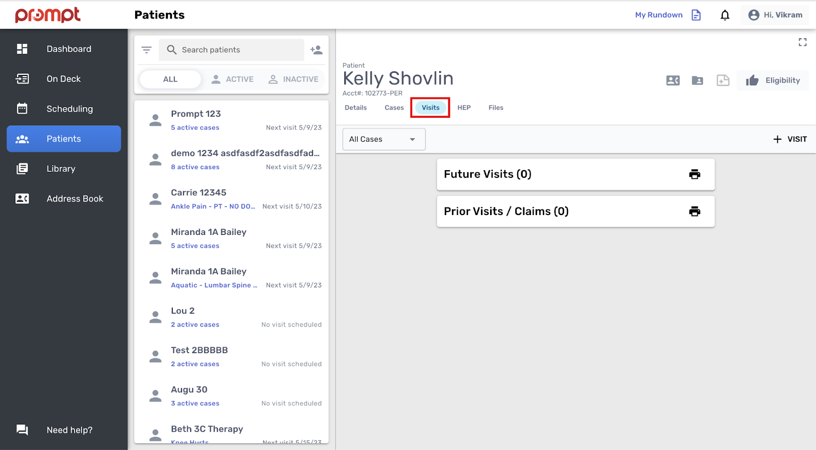 7.) Now that the case has been created, we can navigate to the “Visits” tab to add a visit for the patient. If one has been added already, you can click the relevant visit you’d like to go into.