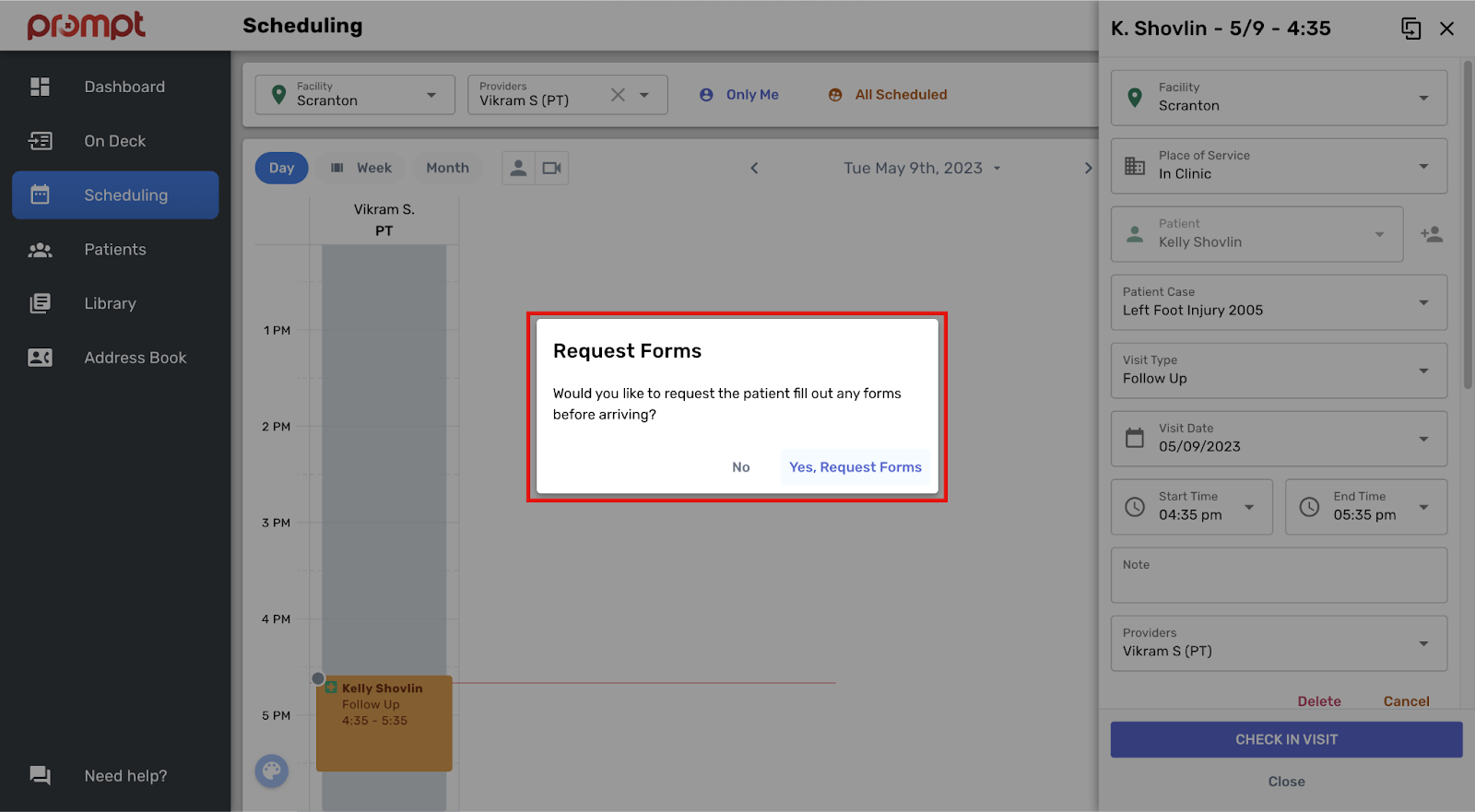 9.) A “Request Forms” pop-up will be displayed, asking if you’d like to request the patient to fill out forms before arriving at the visit. This is entirely up to you to choose the relevant option.