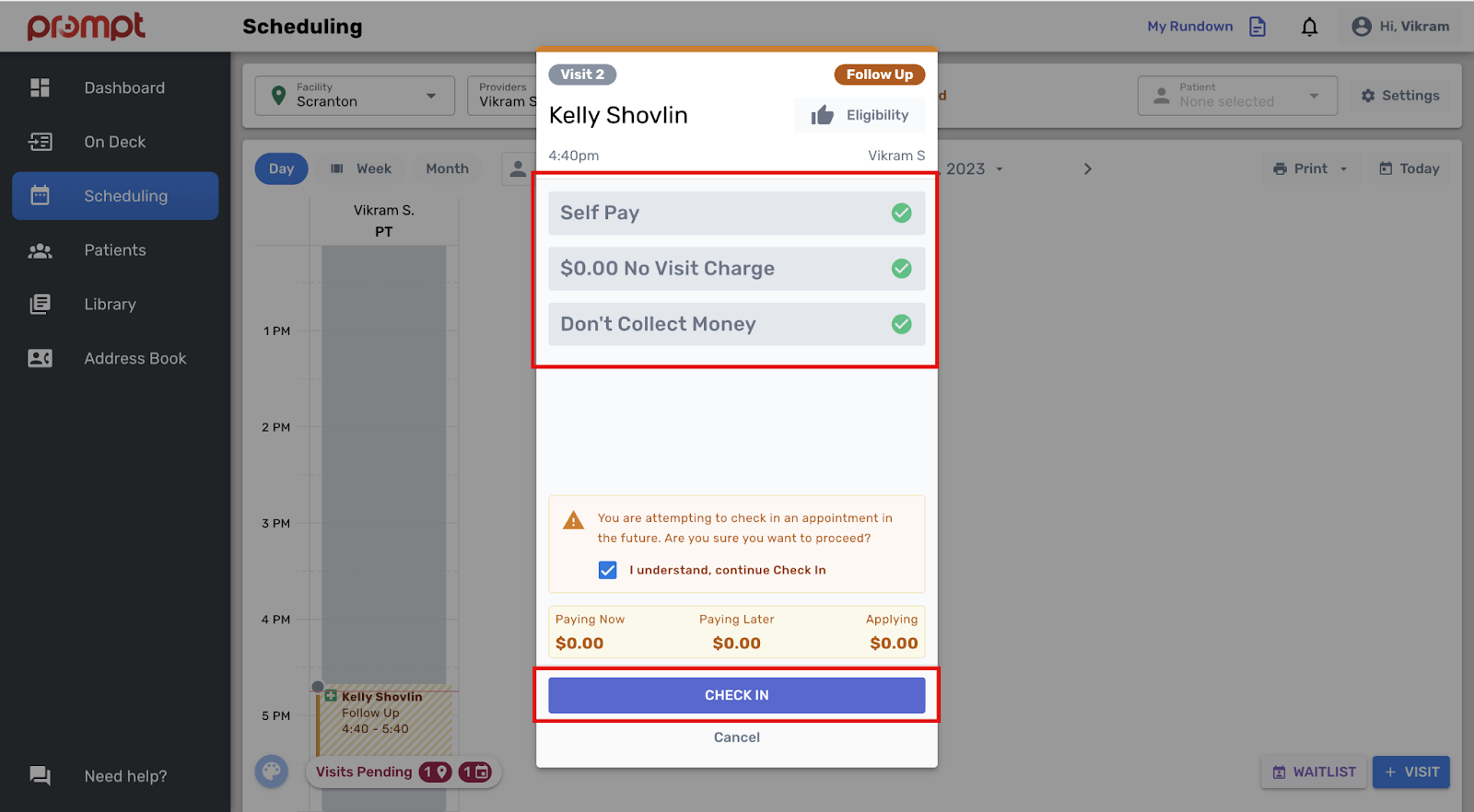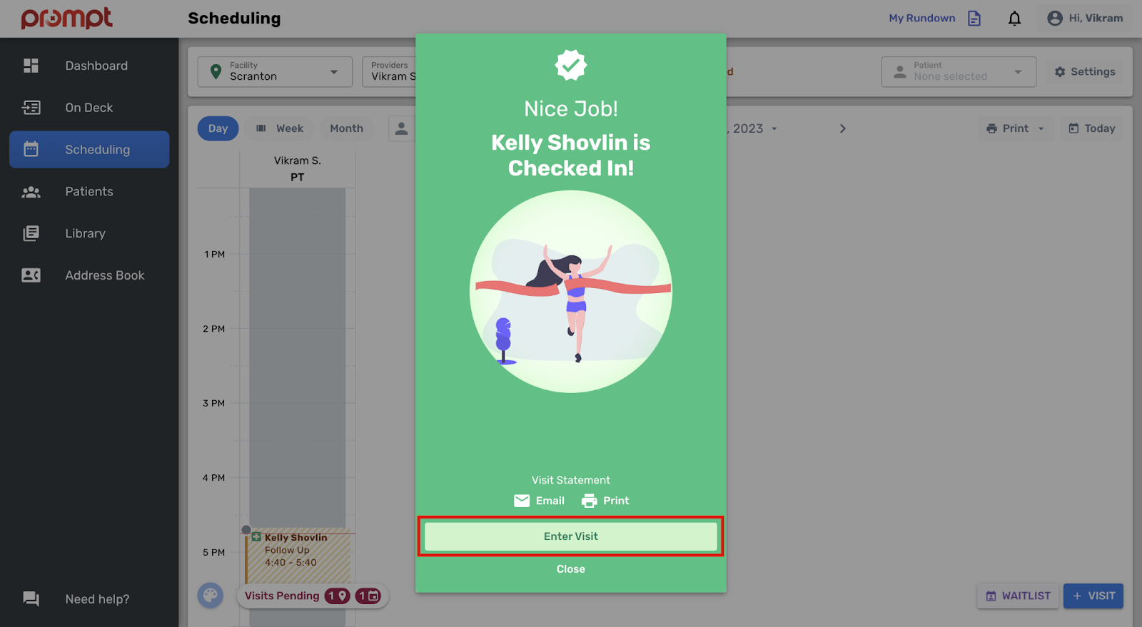 10.) Check in to the visit by clicking the button at the bottom of the pop-up.