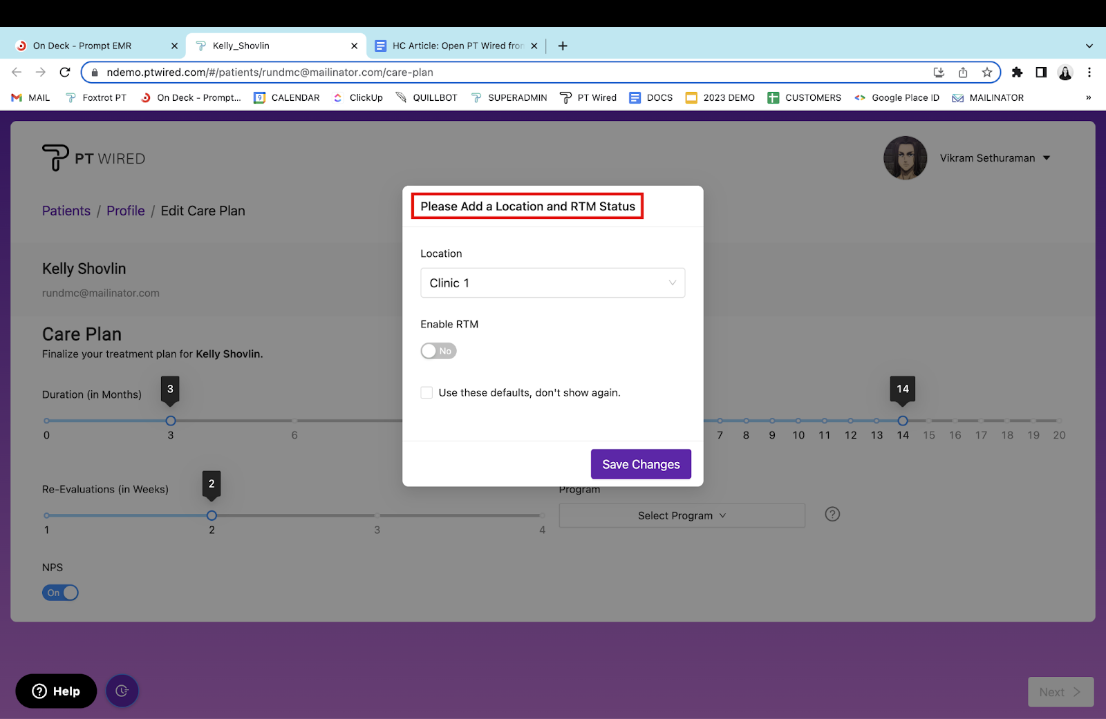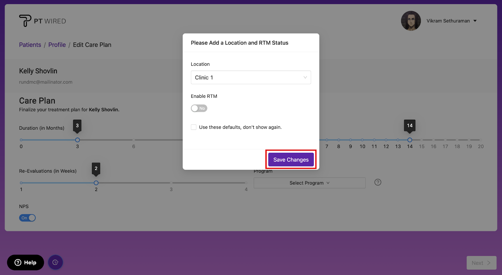 18.) To do this, go to the 'HEP' tab and click the 'Open PT Wired' button. You will automatically directed to the patient's profile. Select the correct patient's location from the pop-up, select the correct RTM Status and then click the 'Save Changes' button.