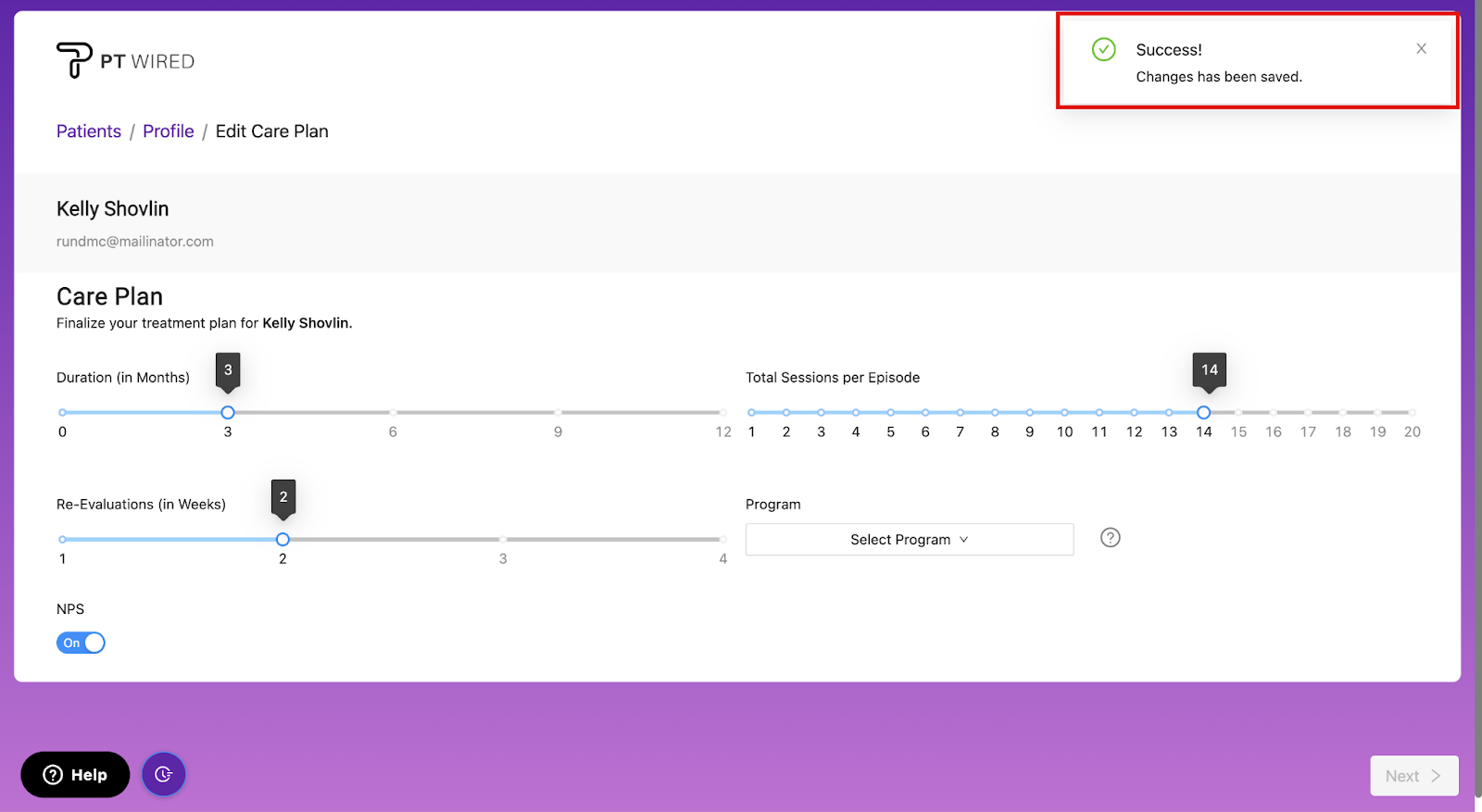 15.) In your PT Wired provider portal you’ll be able to edit the patient’s Care Plan, as well as assign and edit their home exercise programs.