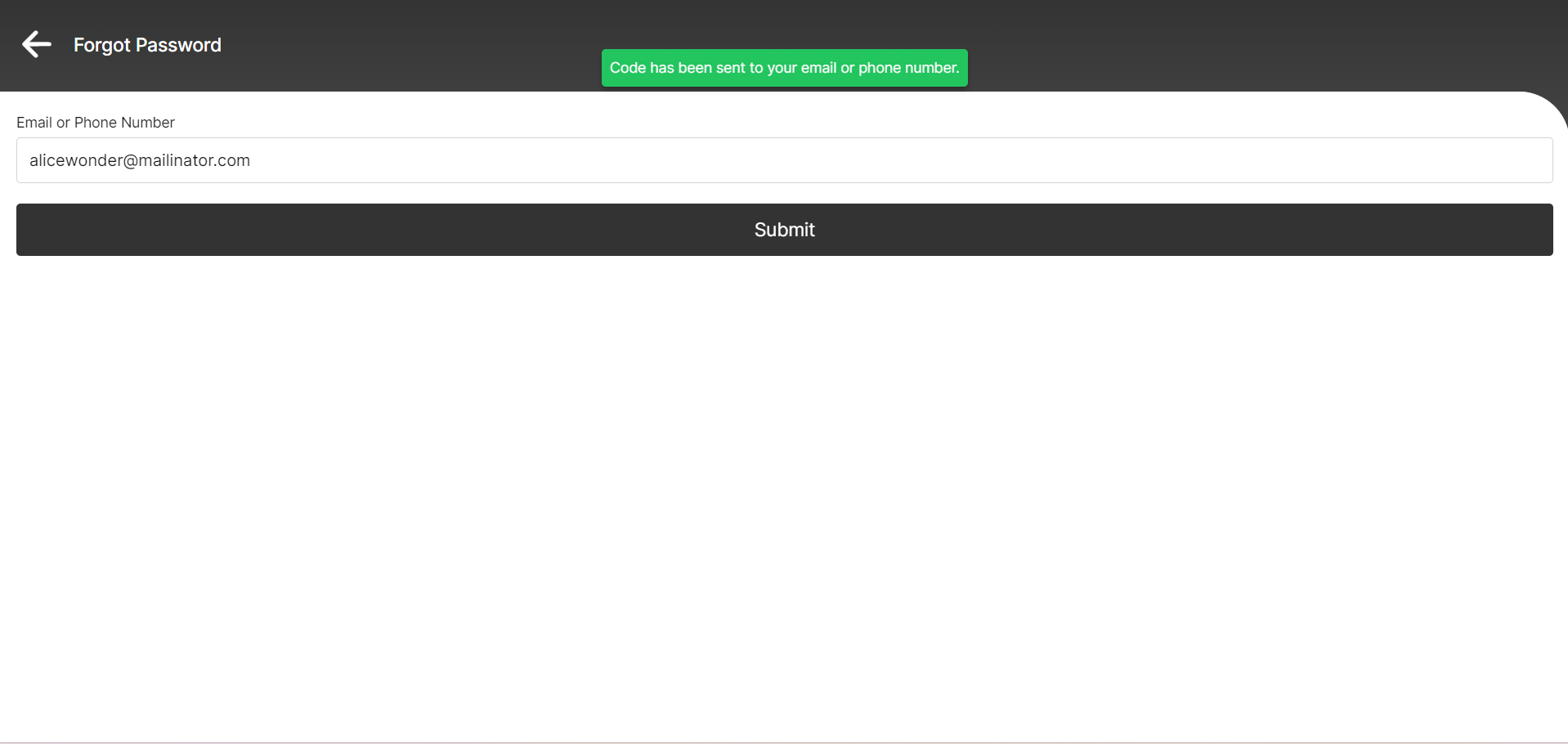 2.) You'll receive a "Code has been sent to your email or phone number" notification informing you that a link to reset your password has been issued to your email address or phone number provided above.