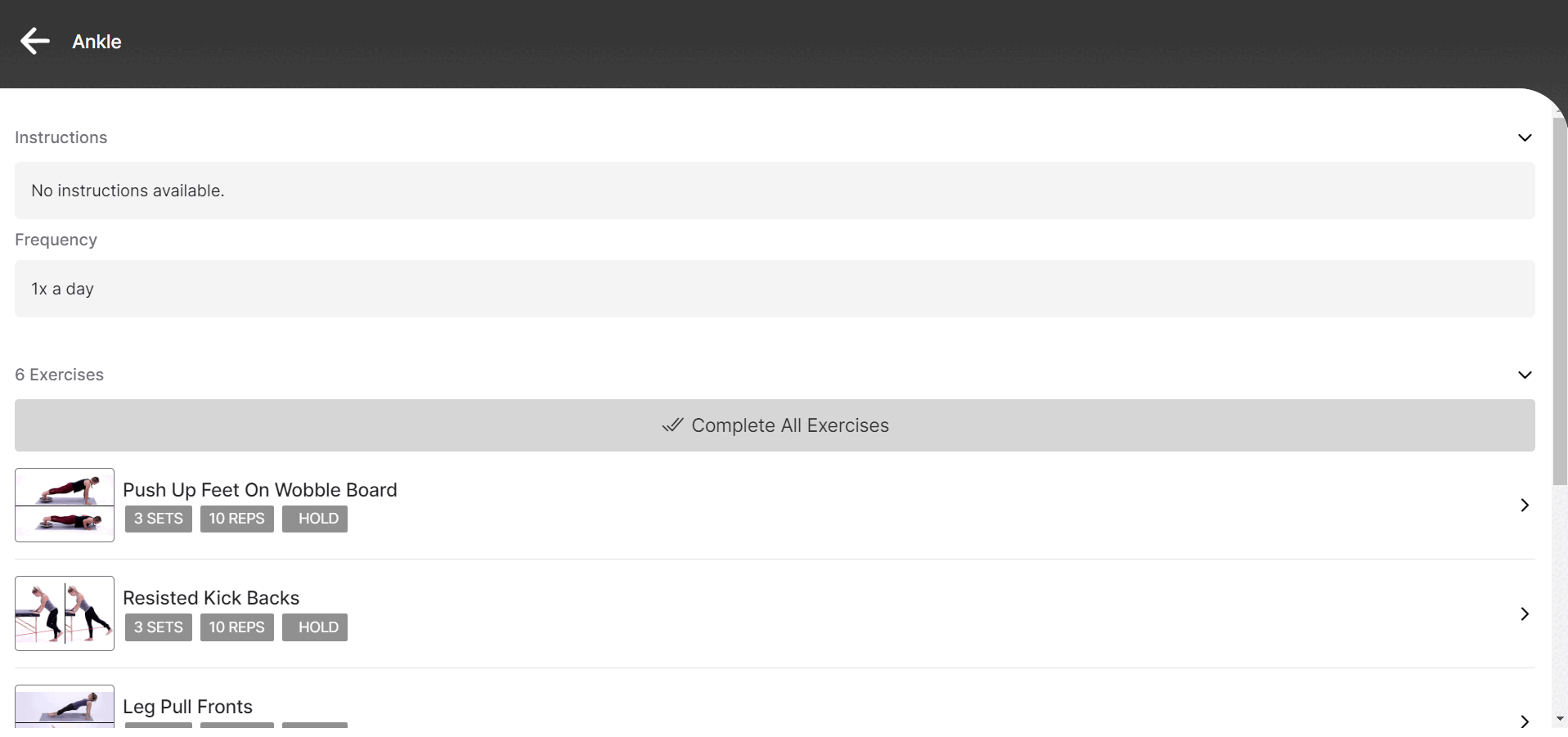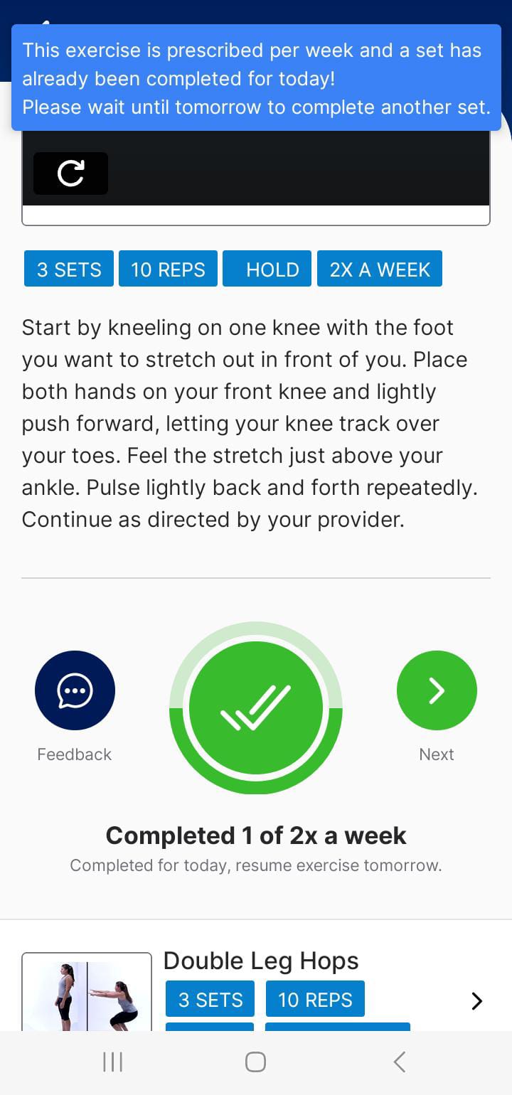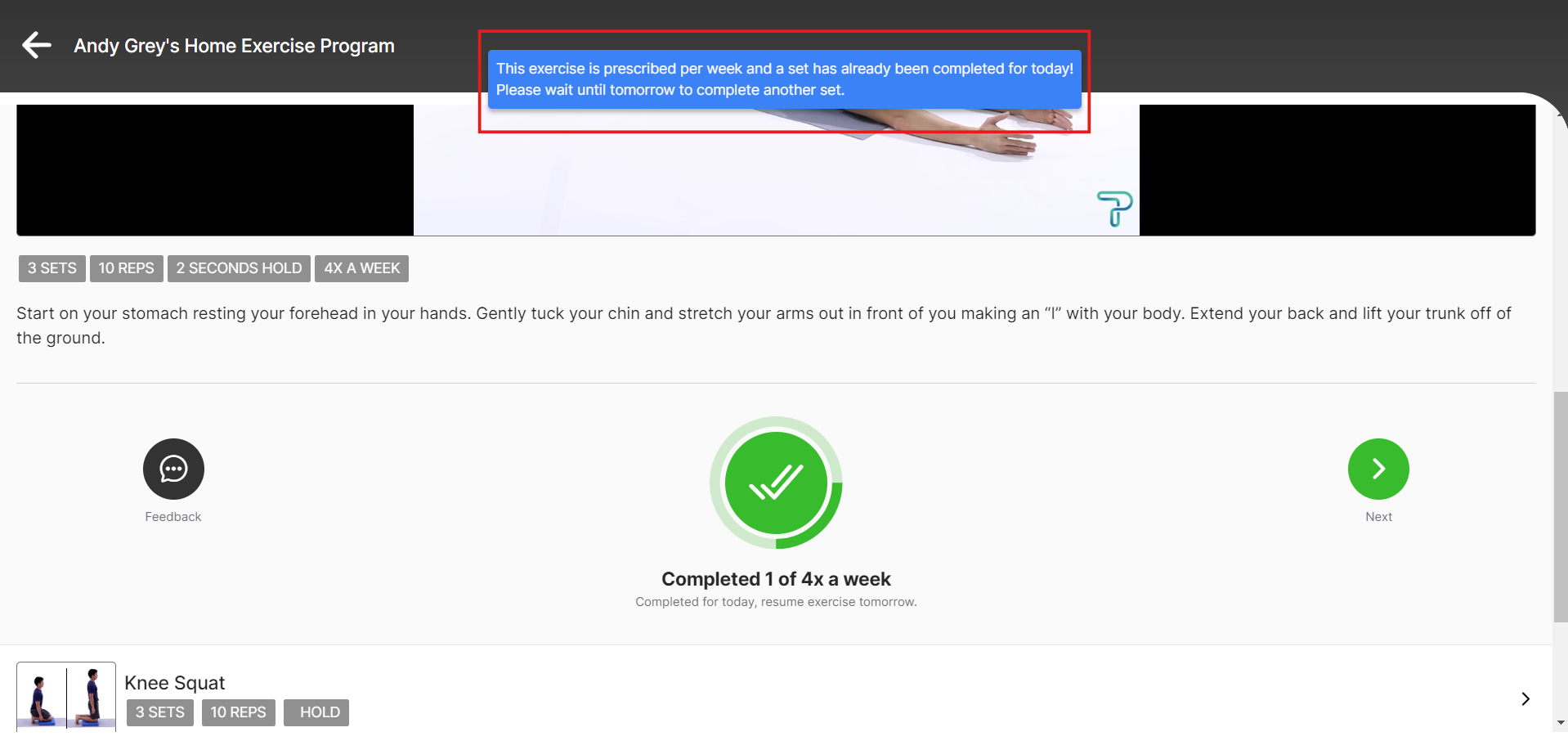 6.) For exercises with a weekly & monthly frequencies, once the exercise has been completed for the day, you will not be able to complete it again until the following week or month. If there is an attempt to complete the exercise again within the same cycle, an alert "This exercise is prescribed per week and a set has already been completed for today! Please wait until tomorrow to complete another set" will pop up notifying you that the exercise has already been completed.