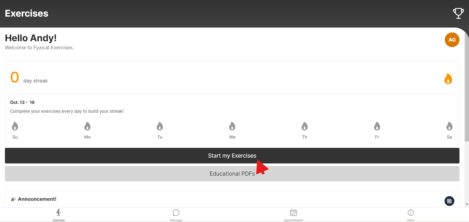 3.) Once you've logged in, you'll be on the Home page (Start Your Exercises.) Click the 'Start Your Exercises' button to view your assigned prescription.