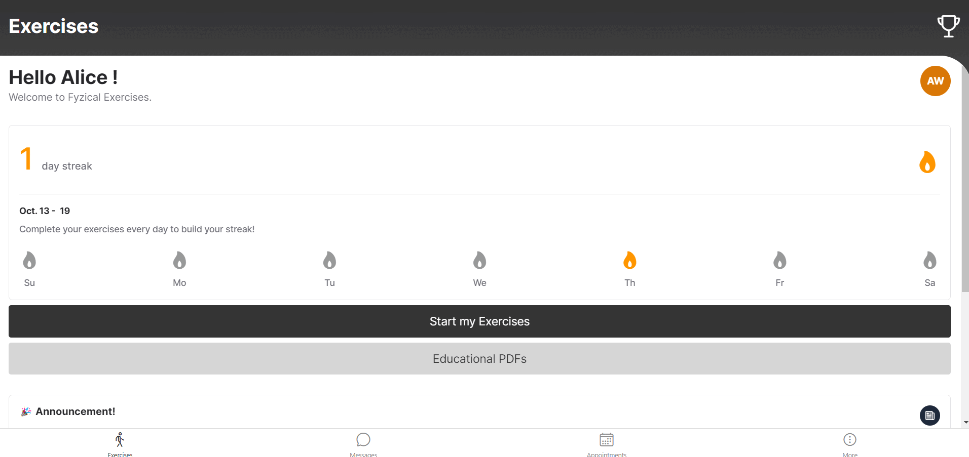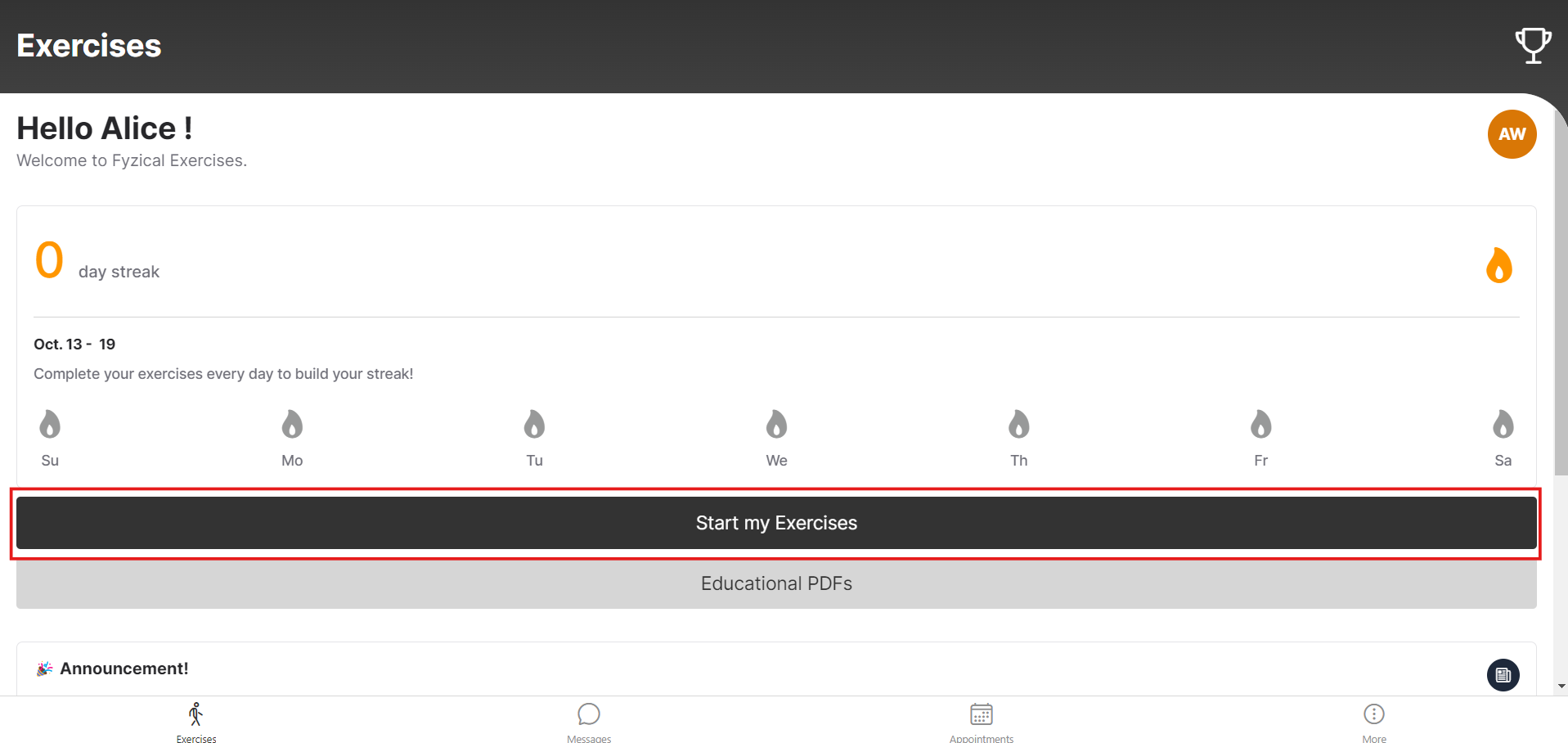 1.) Once you've logged into the branded app, you'll be on the Home page (Start Your Exercises.) Click the 'Start Your Exercises' button to view your assigned prescriptions.