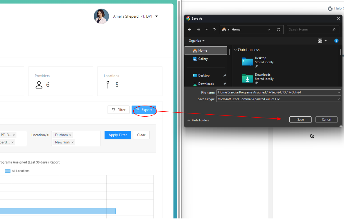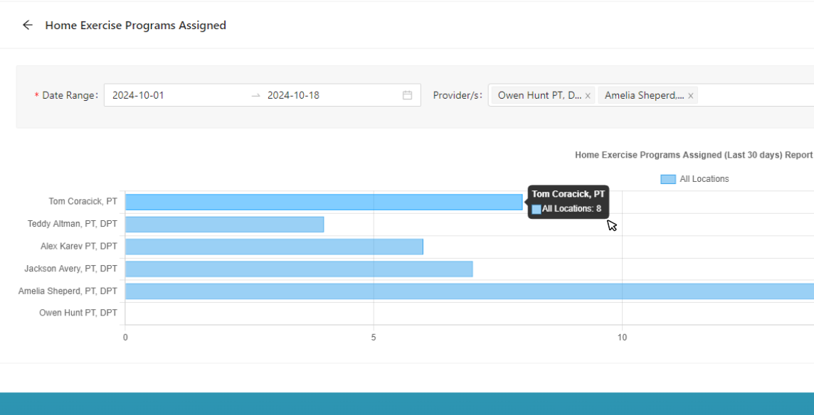4.) In the expanded view of the "Home Exercise Programs Assigned" report, you'll see a bar graph titled "Home Exercise Programs Assigned (Last 30 days) Report" which displays the total number of home exercise programs assigned per provider across all locations.