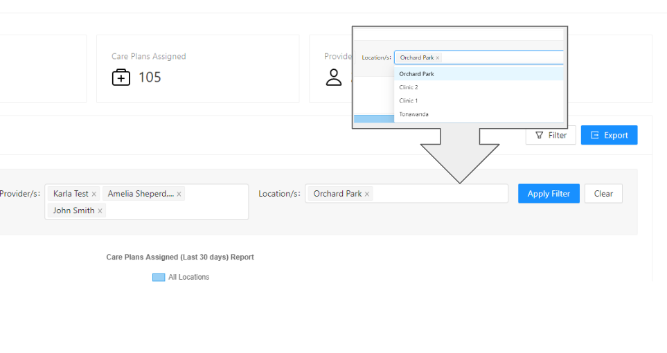 - Location(s) - for clinics with multiple locations, providers can filter through a select number of locations, or exclude locations from the bar graph data.