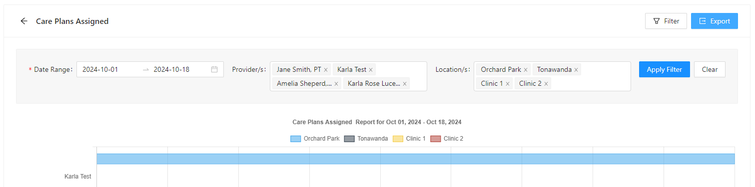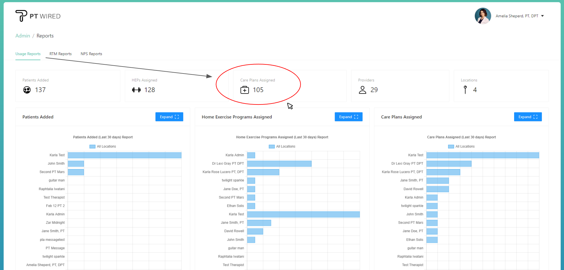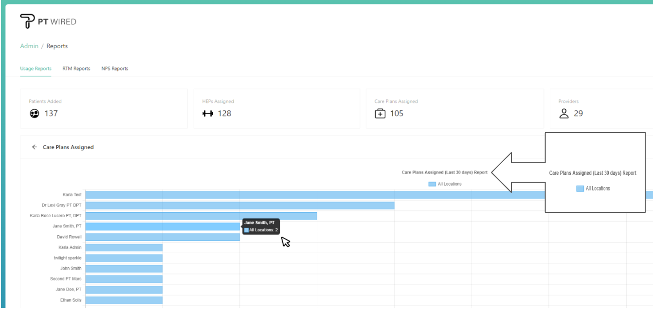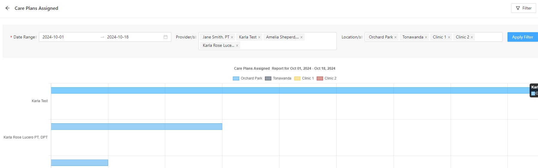 4.) In the expanded view of the "Care Plans Assigned" report, you'll see a bar graph titled "Care Plans Assigned (Last 30 days) Report" which displays the total number of care plans assigned per provider across all locations.