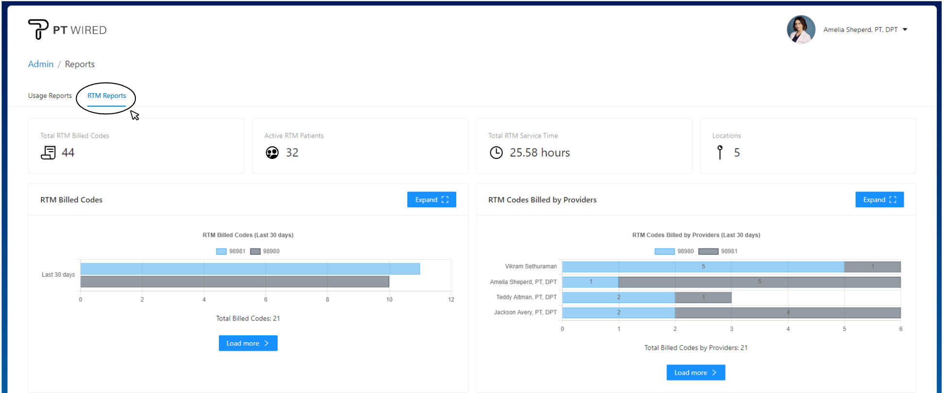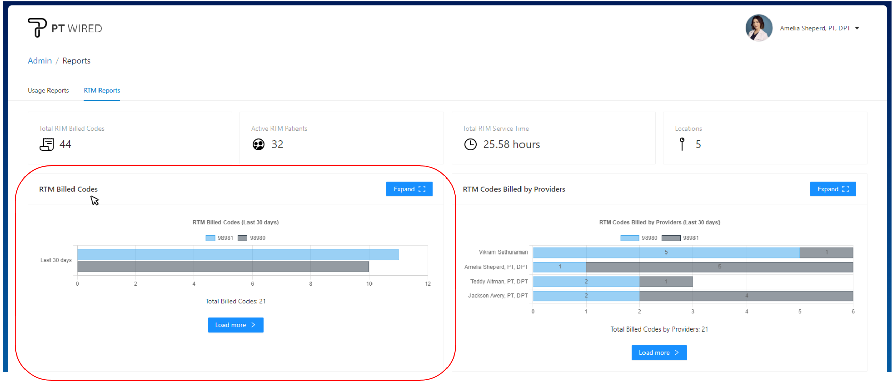 2.) The first report displayed is the "RTM Codes Billed," in the form of a bar graph. The data shown is from the previous 30 days.