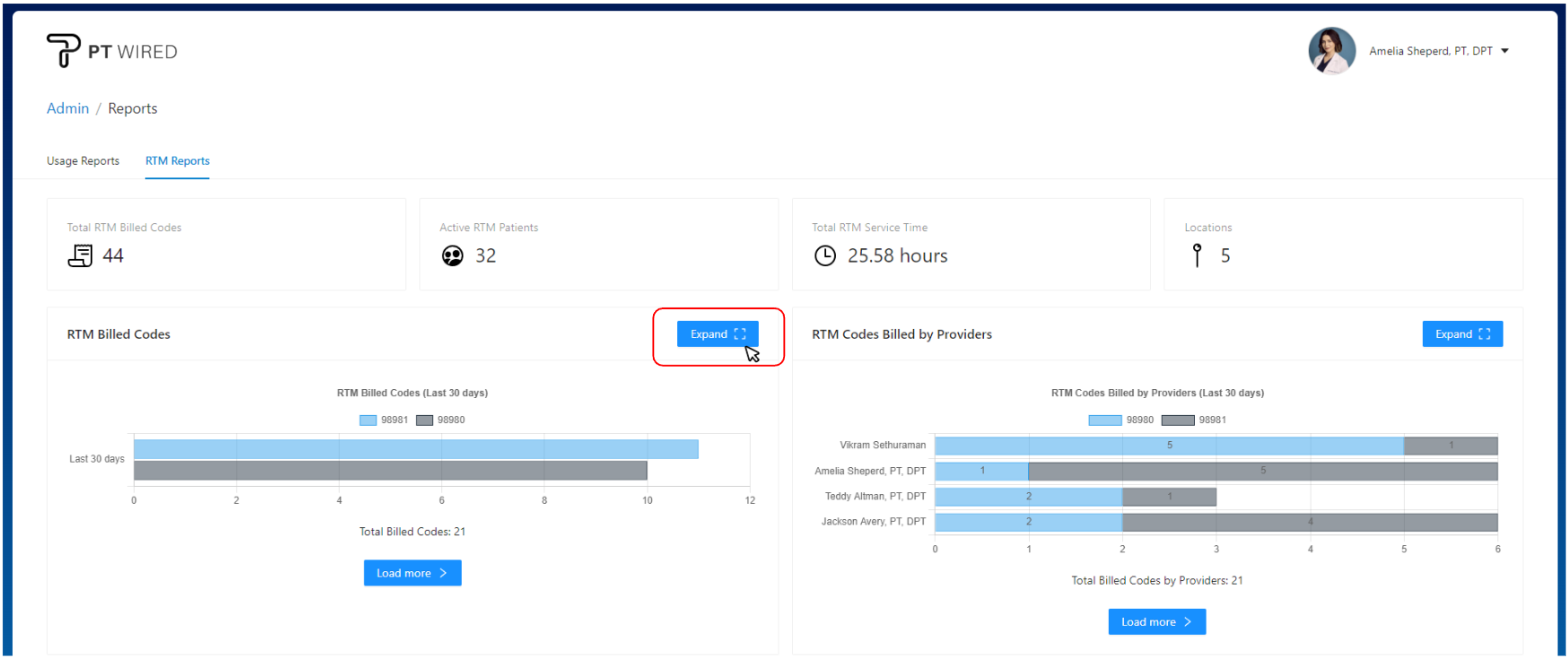 3.) Once clicking either the "Expand" or "Load More" button, the bar graph will be expanded. From here, scroll your mouse or cursor over each bar to get the total number of the RTM codes billed in the last 30 days across all locations.