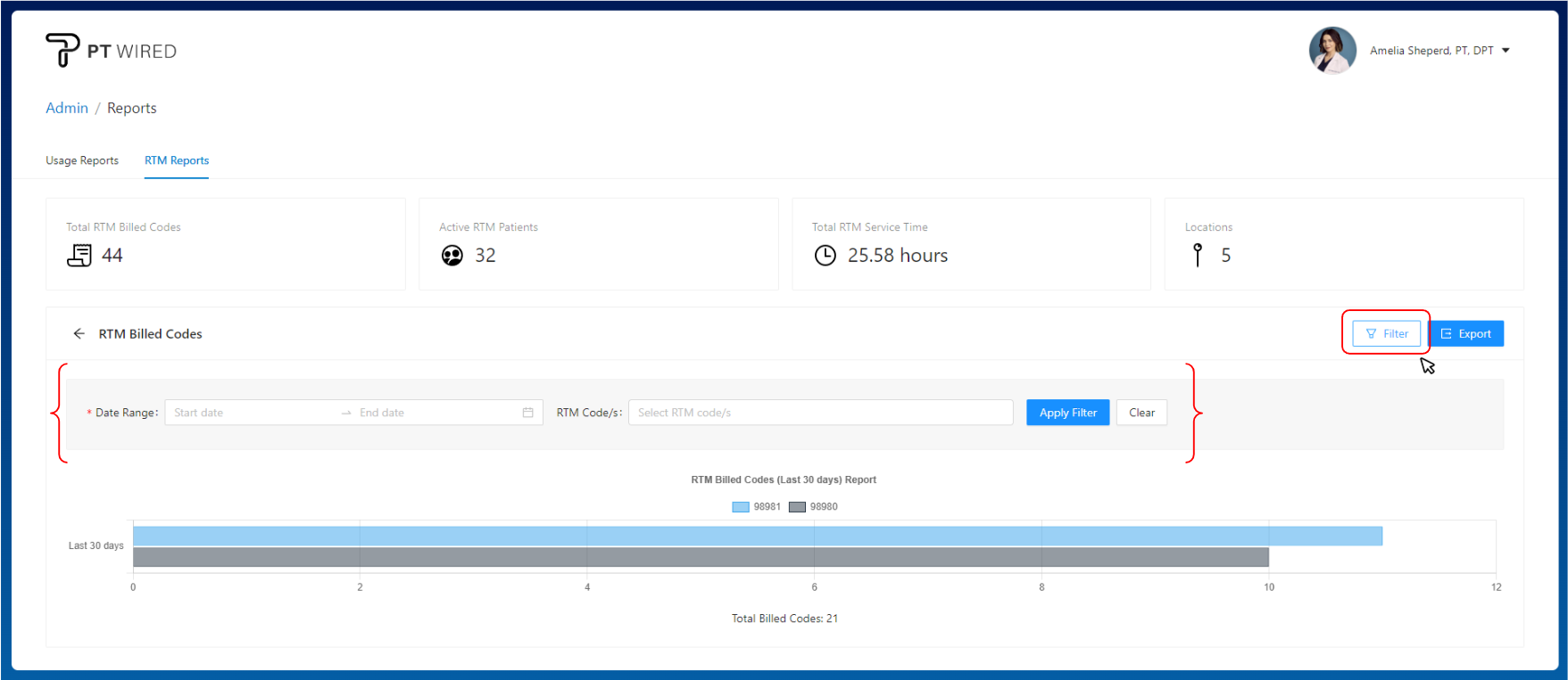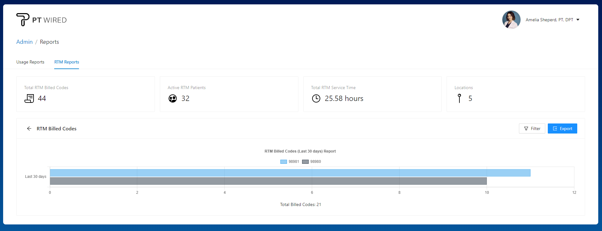 At the core of our RTM Reports is the bar graph showcasing the RTM codes that have been billed, providing a visual representation of clinic performance over time.