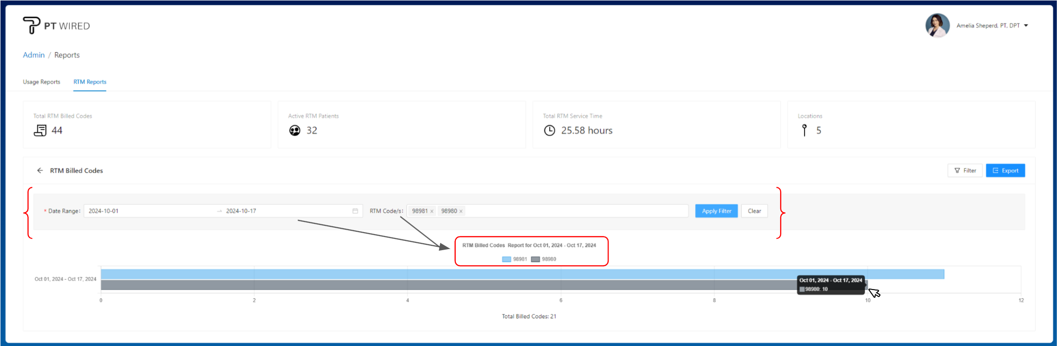 6.) Once the filters have been applied, the bar graph will display the filtered data. Hover your cursor over a bar in the graph to see the total number of RTM Codes Billed, per code.