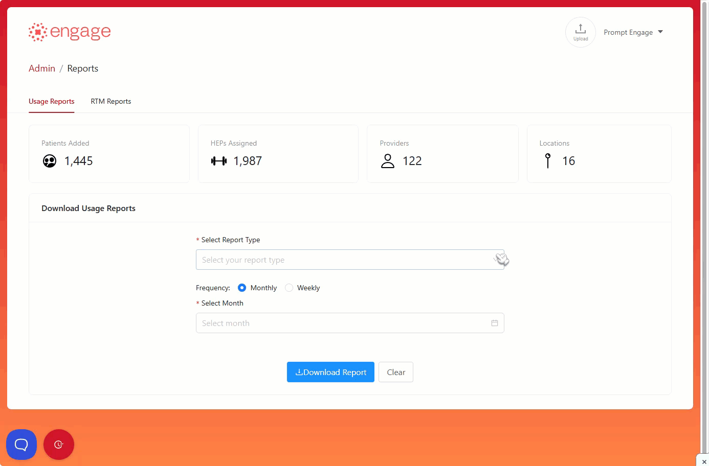 2.) From the Reports Dashboard, you can navigate to either the Usage or RTM Reports. Select the specific type of report and for which week or month.