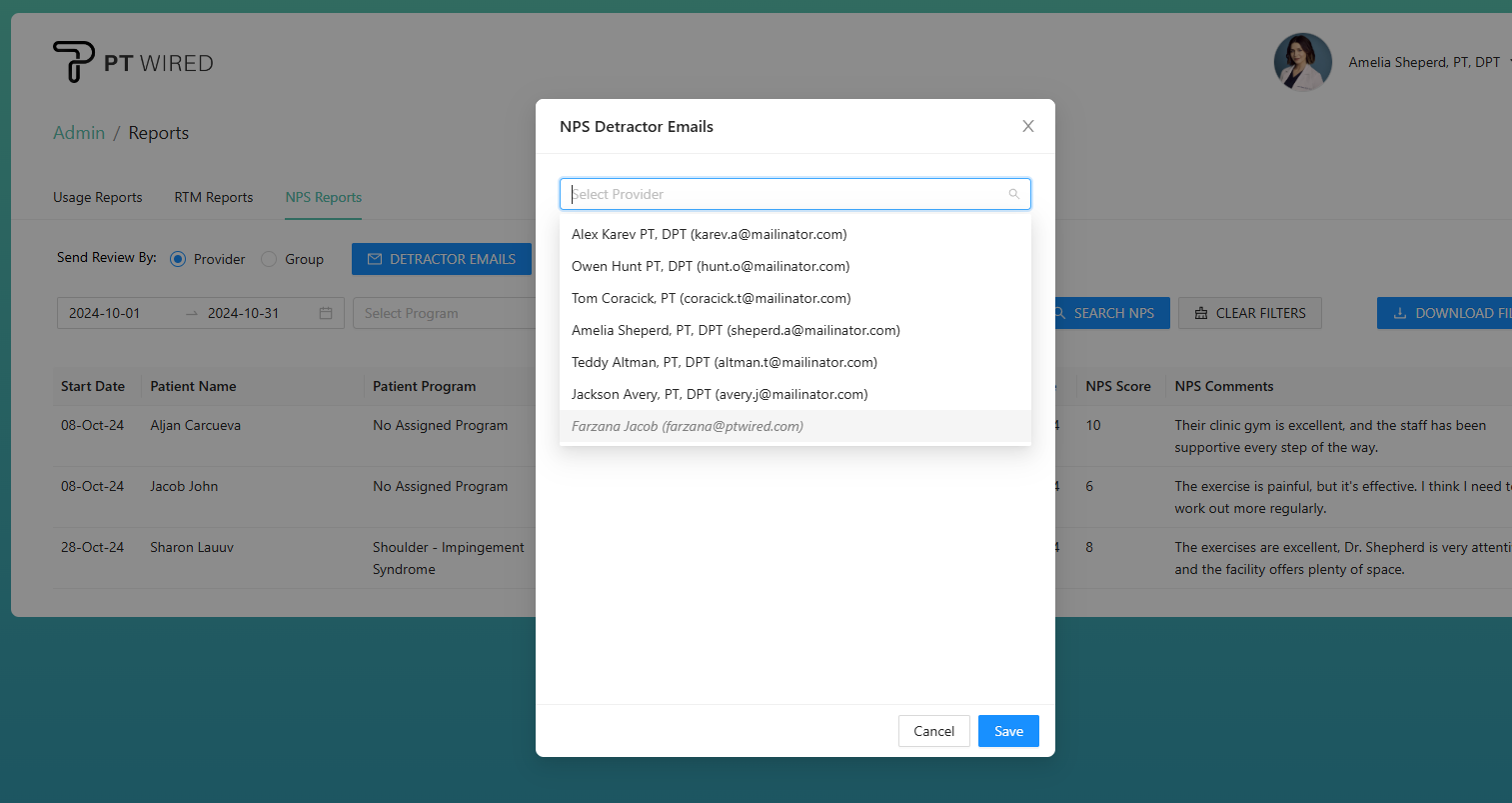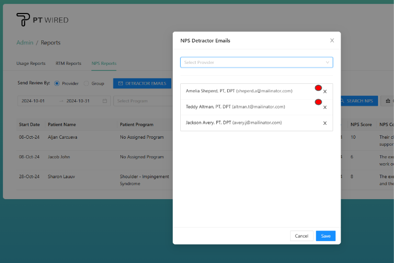 4.) Search for providers (by name or email) from the search bar or select the provider(s) using the "Select Provider" dropdown menu to add them to the Detractor Emails list.